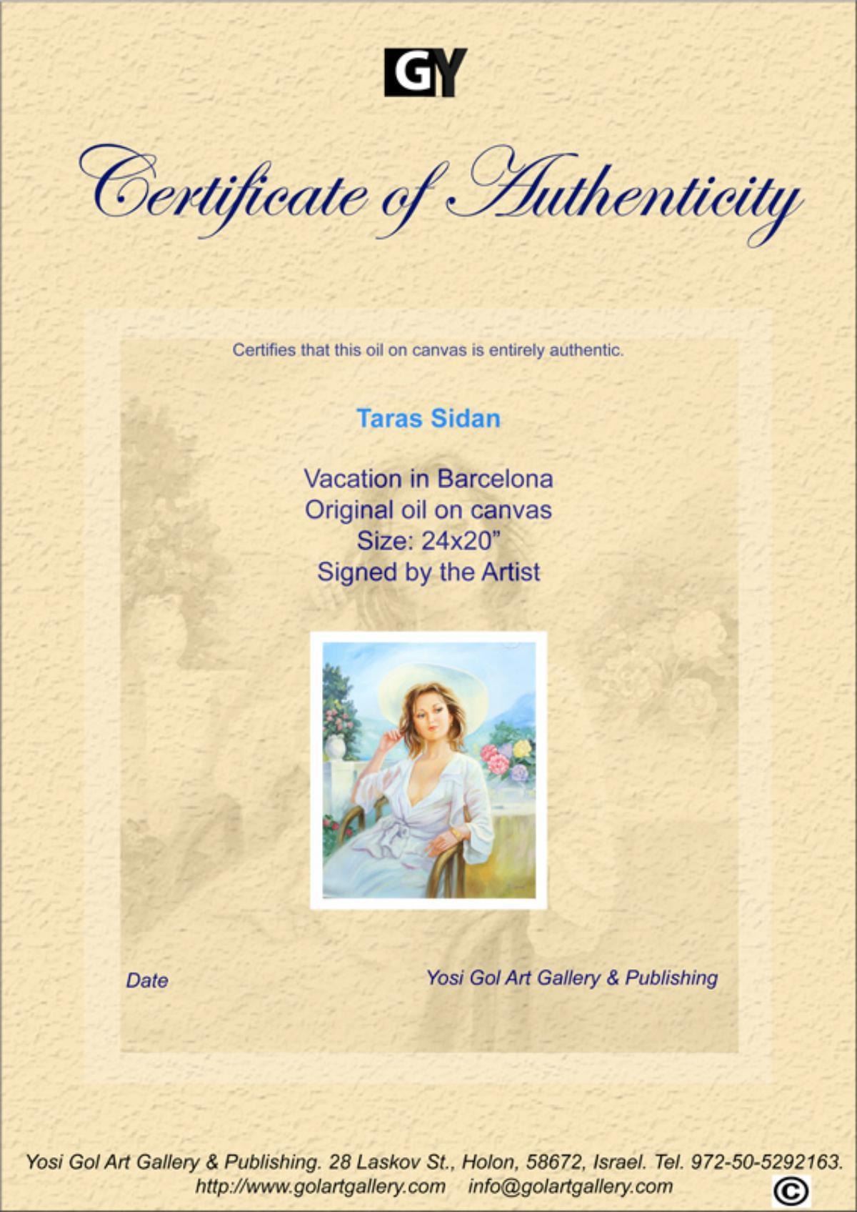Artist: Taras Sidan. Medium: Original Oil on Canvas. Title: Vacation in Barcelona. Size (Unframed): 24" x 20". Certificate of Authenticity: From the publisher. Reference# 10306.