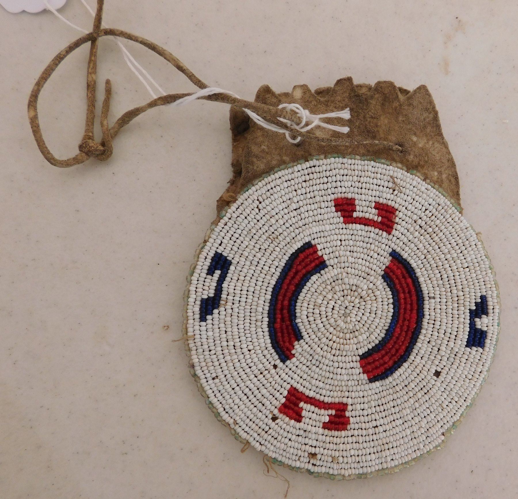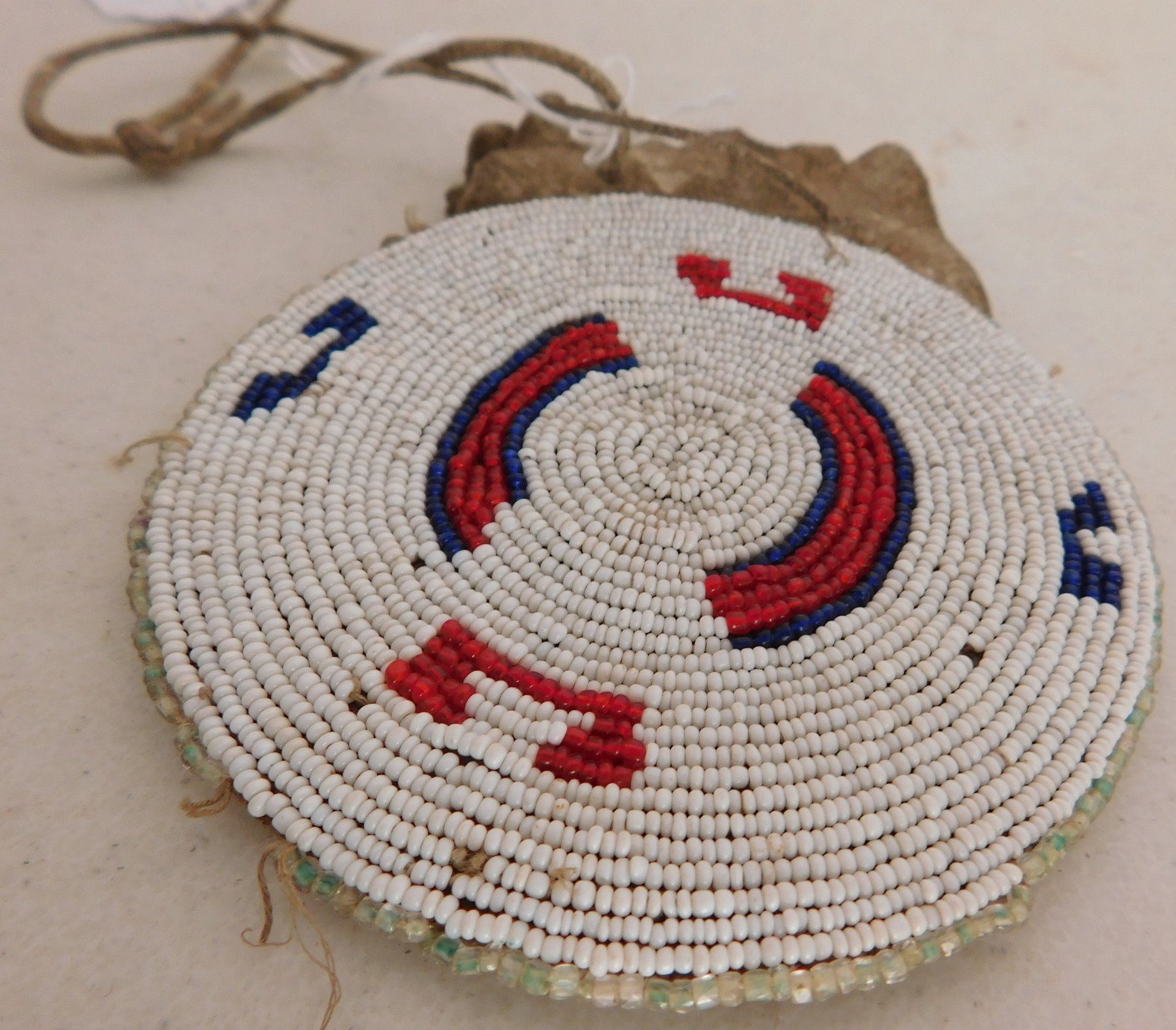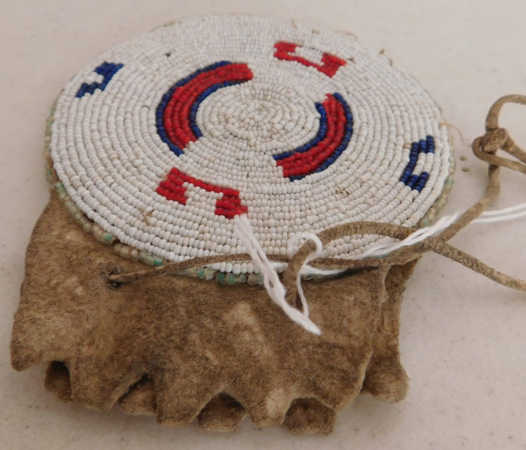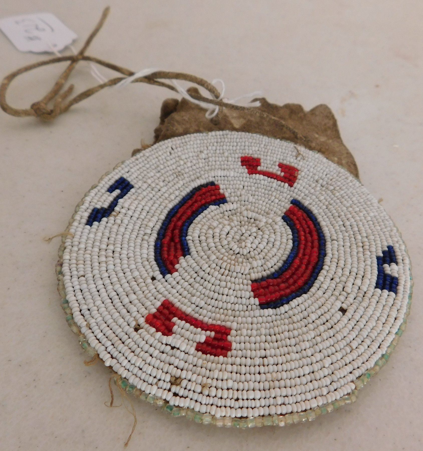 Target Beaded Ration Bag, c. 1890s. Made of deerhide and glass, the item measures 5" x 4". Possibly Cheyenne. Used to hold rations tokens for Native Americans. Condition: Dirty on back. Shipping: $20.00 w/insurance and signature.