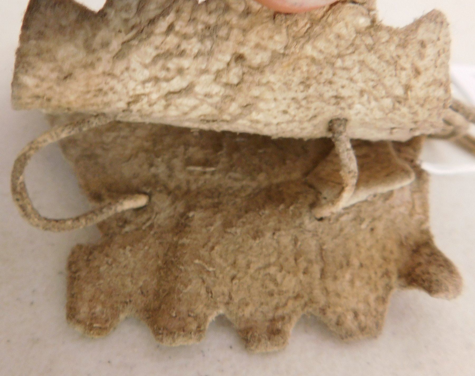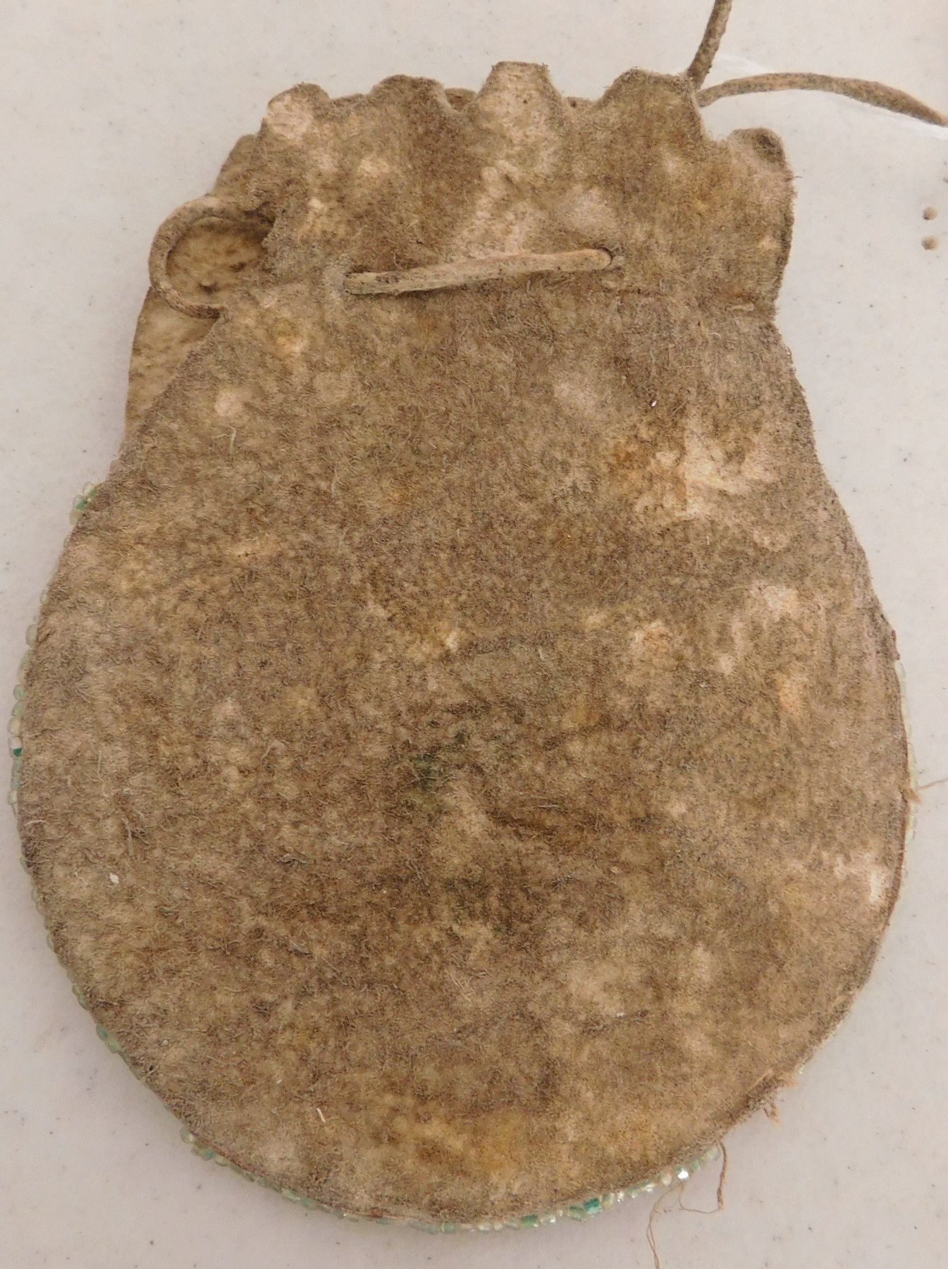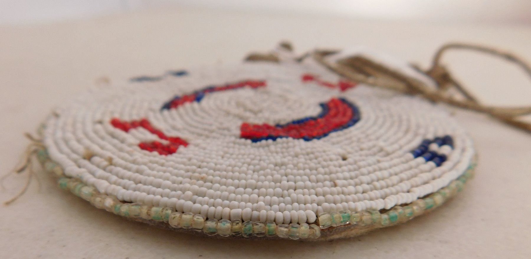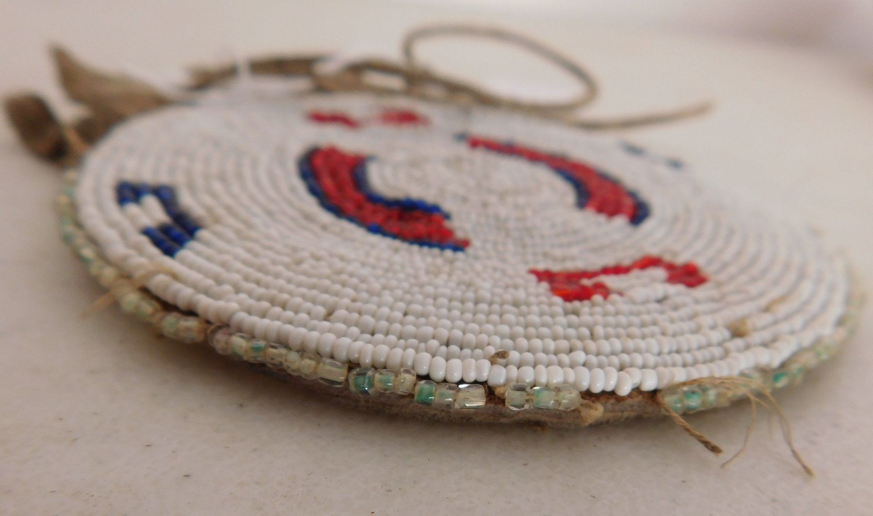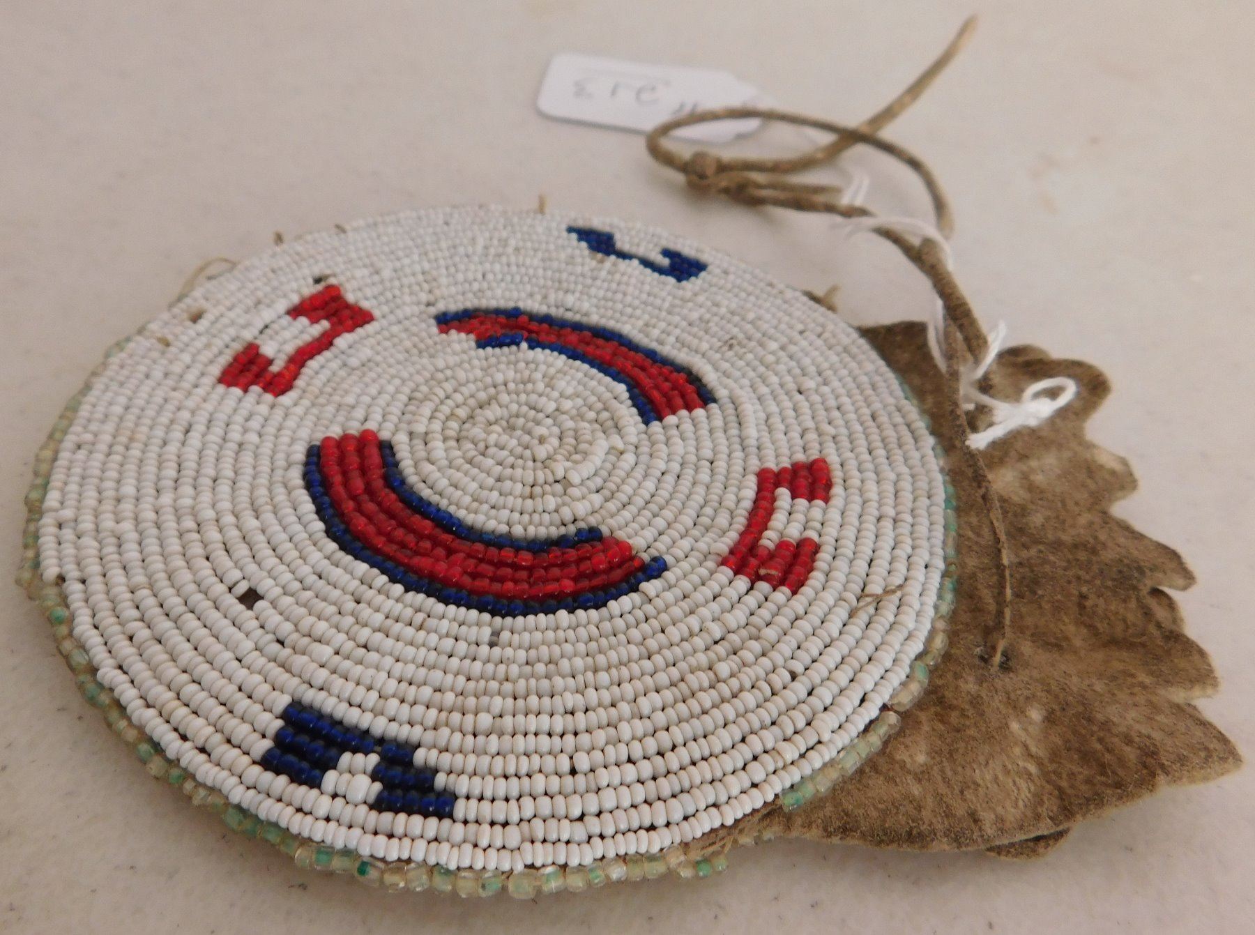 Target Beaded Ration Bag, c. 1890s. Made of deerhide and glass, the item measures 5" x 4". Possibly Cheyenne. Used to hold rations tokens for Native Americans. Condition: Dirty on back. Shipping: $20.00 w/insurance and signature.