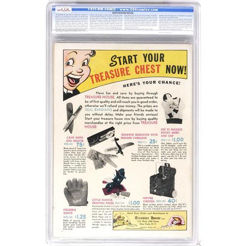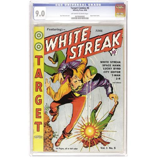<B>Target Comics #5 (Novelty Press, 1940) CGC VF/NM 9.0 Off-white to white pages.</B></I> Basil Wolverton is an artist more and more collectors are discovering, and this issue has the debut of his Space Hawk feature. The android known as the White Streak was the top star of this series, but as so often happened with superheroes, the character had appeared several times without his origin being recounted. That's taken care of in a text story in this issue. Other interior artists include Bill Everett (of Sub-Mariner fame) and Carl Burgos (of Human Torch fame), as well as Miss Fury's creator Tarpe Mills. Overstreet 2006 VF/NM 9.0 value = $4,893; NM- 9.2 value = $6,850. CGC census 6/06: 1 in 9.0, 2 higher. <BR><BR><B>Important notice:</B> Heritage usually auctions material at the rate of 200-250 lots per hour. On some occasions eBay Live bid software or the Internet may not be able to keep up with the pace of the auction. We recommend placing a realistic absentee bid now as insurance to avoid disappointment. Occasionally the auctioneer may eliminate or reject an eBay Live bid, and the auctioneer may also reopen a lot after the close of the eBay live bidding (usually because we missed an audience bid), and may reject your bid even if it shows you as the winning bidder. By bidding via eBay Live, you agree that Heritage may award the lot to another bidder at its sole discretion under the circumstances described above or any other reasonable circumstances. Since eBay bids are not shown to us until we open the lot on the floor, we treat those bids just like floor bids. In most cases the floor responds before the eBay bid is presented to us, due to Internet lag time, so for consistency we have made it a policy that floor bids are always considered first over tie eBay live bids. Also please note that all Heritage lots purchased through eBay Live carry a 22.5% Buyer's Premium. Please make sure you read the Terms and Conditions before you bid. This lot is being auctioned in conjunction with a live floor auction by Heritage Auction Galleries. All final auction and invoice information will be supplied by Heritage Auction Galleries, and all other information should be considered preliminary. Lot:41001 <BR><BR><B>Winning Notification and Billing:</B> After the FINAL session in this auction is complete, Heritage will send e-mail and snail mail invoices. This process normally takes several days. All final auction and invoice information will be supplied by Heritage Auction Galleries, and all other information should be considered preliminary. <BR><BR>This auction will be conducted on a live auction floor and over the Internet through eBay Live. If you choose to place an absentee bid, please take a moment to <font color='#0000ff'><u><a href='http://pages.ebay.com/liveauctions/help/before/laabsentee.html'>learn how eBay Live absentee bidding works</a></u></font><font color='#000000'>