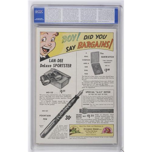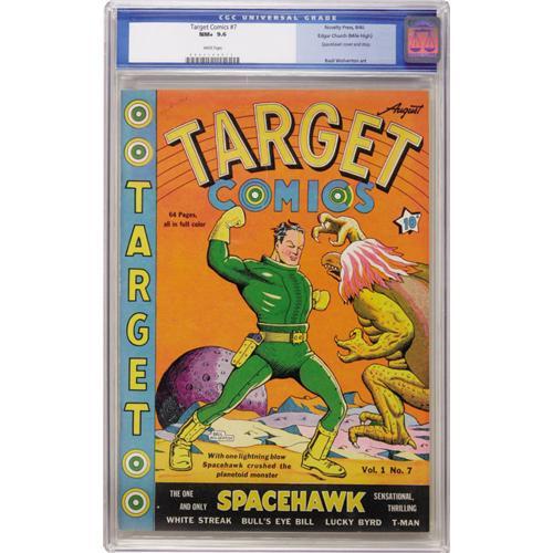 Content, scarcity, and grade are the factors that drive the value of a comic book, and here's a gem that combines all three. The Spacehawk cover by the much-collected Basil Wolverton makes the issue desirable in itself, but other big names from the "Funnies Inc." shop like Bill Everett (of Sub-Mariner fame), Carl Burgos (who created the Human Torch) and Tarpe Mills (creator of Miss Fury) also contributed to the issue, with Wolverton adding interior art as well. As for scarcity, Overstreet gives the book its seldom-used "scarce" designation, and Gerber's Photo-Journal assigns it a coveted "8." As for the condition, it's absolutely remarkable, with sharp corners and perfect interior page quality. The next-best certified copy as of this writing is a distant VF+ 8.5. Overstreet 2005 NM- 9.2 value = $8,600. CGC census 12/06: 1 in 9.6, none higher. <BR><BR><b>Shipping:</b> Slabbed Comic (<a target="_blank" href="http://www.heritageauctions.com/common/shipping.php">view shipping information</a>)
