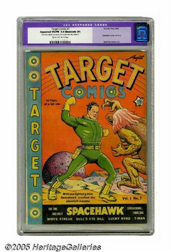 <B>Target Comics #7 (Novelty Press, 1940) CGC Apparent VG/FN 5.0 Moderate (P) Cream to off-white pages.</B></I> Collector's favorite Basil Wolverton brought his quirky style to this Spacehawk cover. Wolverton also contributed interior art to the issue, as did Bill Everett, Carl Burgos, and Tarpe Mills. Overstreet gives the book its seldom-used "scarce" designation, and Gerber assigns it a coveted "8." CGC notes, "Restoration includes: color touch, pieces added, tear seals, reinforced." Overstreet 2005 GD 2.0 value = $503; VG 4.0 value = $1,006; FN 6.0 value = $1,509.