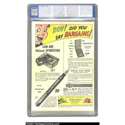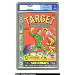 Target Comics #7 (Novelty Press, 1940) CGC VF+ 8.5 Off-white pages. Stranded on the silent planet, Space Hawk prepares to pummel the space alien in this classic science fiction cover. A purple moon rises slowly behind the sparse landscape as Space Hawk's muscles tense and strain to crush the bizarre reptilian monster. The eccentric unsung genius of comics, Basil Wolverton, who drew only twelve covers, created this magnificent one and only cover appearance of Space Hawk. The interior includes a Space Hawk story by Wolverton, along with stories by Timely greats Bill Everett and Carl Burgos. If you want a Wolverton cover, and this is widely regarded as his best, then you have only a few comics to choose from. And there are so few copies of this comic in existence that even Overstreet notes that the book is scarce. Do not kid yourself in thinking that you will have another chance to get such a sharp-looking, strictly-graded copy with white pages. This book is insanely difficult to find. According to the CGC census this is the second highest graded copy with only the Mile High grading higher. Overstreet 2002 VF 8.0 value = $2,925. Important notice: We expect to be auctioning lots at the rate of 200-250 per hour. Sometimes eBay Premier live bid software cannot keep up with that pace, so we strongly recommend that you place a realistic proxy bid now as insurance to avoid disappointment. Also please note that all Heritage/CAA lots purchased through eBay Premier carry a 20% Buyer's Premium. Please make sure you read the Terms and Conditions.