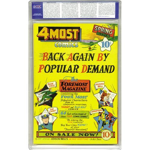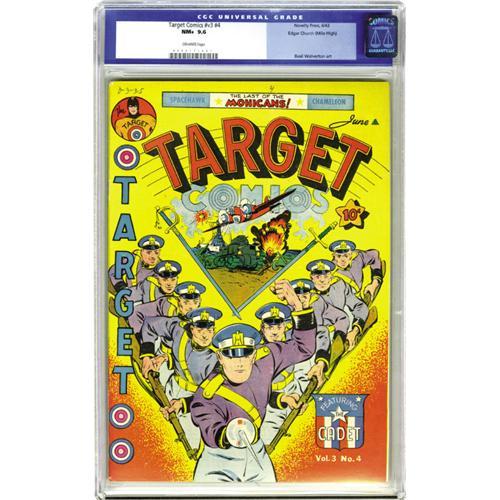 <B>Target Comics V3#4 Mile High pedigree (Novelty Press, 1942) CGC NM+ 9.6 Off-white pages.</B></I> A rousing V-for-victory cover makes this issue stand out, and what makes this <I>copy</B></I> stand out is the incredible condition. It's actually the only copy of the issue that CGC has certified as of this writing. The most notable interior feature is Spacehawk by Basil Wolverton. Overstreet 2006 NM- 9.2 value = $825. CGC census 5/06: 1 in 9.6, none higher. <BR><BR><B>Important notice:</B> Heritage usually auctions material at the rate of 200-250 lots per hour. On some occasions eBay Live bid software or the Internet may not be able to keep up with the pace of the auction. We recommend placing a realistic absentee bid now as insurance to avoid disappointment. Occasionally the auctioneer may eliminate or reject an eBay Live bid, and the auctioneer may also reopen a lot after the close of the eBay live bidding (usually because we missed an audience bid), and may reject your bid even if it shows you as the winning bidder. By bidding via eBay Live, you agree that Heritage may award the lot to another bidder at its sole discretion under the circumstances described above or any other reasonable circumstances. Since eBay bids are not shown to us until we open the lot on the floor, we treat those bids just like floor bids. In most cases the floor responds before the eBay bid is presented to us, due to Internet lag time, so for consistency we have made it a policy that floor bids are always considered first over tie eBay live bids. Also please note that all Heritage lots purchased through eBay Live carry a 22.5% Buyer's Premium. Please make sure you read the Terms and Conditions before you bid. This lot is being auctioned in conjunction with a live floor auction by Heritage Auction Galleries. All final auction and invoice information will be supplied by Heritage Auction Galleries, and all other information should be considered preliminary. Lot:41001 <BR><BR><B>Winning Notification and Billing:</B> After the FINAL session in this auction is complete, Heritage will send e-mail and snail mail invoices. This process normally takes several days. All final auction and invoice information will be supplied by Heritage Auction Galleries, and all other information should be considered preliminary. <BR><BR>This auction will be conducted on a live auction floor and over the Internet through eBay Live. If you choose to place an absentee bid, please take a moment to <font color='#0000ff'><u><a href='http://pages.ebay.com/liveauctions/help/before/laabsentee.html'>learn how eBay Live absentee bidding works</a></u></font><font color='#000000'>