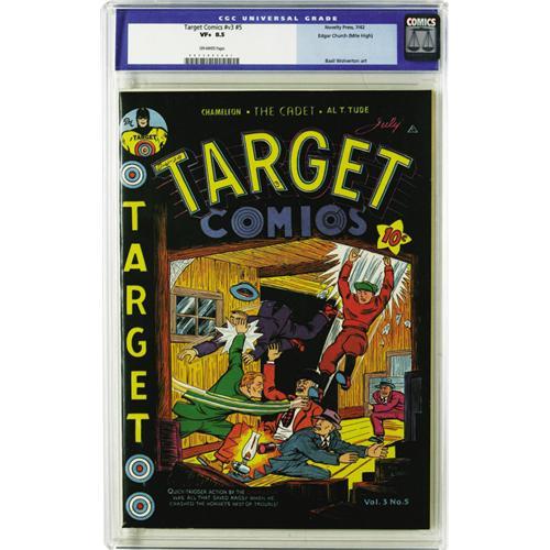 <B>Target Comics V3#5 Mile High pedigree (Novelty Press, 1942) CGC VF+ 8.5 Off-white pages.</B></I> Considering this issue's black cover, it's going to be tough to top the Edgar Church copy, and no other copy has done so yet. Basil Wolverton's Spacehawk appears in the issue. Cover billing went to that master of disguise known as the Chameleon, and he's drawn by an artist we know for his Timely work, namely Al Fagaly. Overstreet 2006 VF 8.0 value = $350; VF/NM 9.0 value = $555. CGC census 6/06: 1 in 8.5, none higher. <BR><BR><B>Important notice:</B> Heritage usually auctions material at the rate of 200-250 lots per hour. On some occasions eBay Live bid software or the Internet may not be able to keep up with the pace of the auction. We recommend placing a realistic absentee bid now as insurance to avoid disappointment. Occasionally the auctioneer may eliminate or reject an eBay Live bid, and the auctioneer may also reopen a lot after the close of the eBay live bidding (usually because we missed an audience bid), and may reject your bid even if it shows you as the winning bidder. By bidding via eBay Live, you agree that Heritage may award the lot to another bidder at its sole discretion under the circumstances described above or any other reasonable circumstances. Since eBay bids are not shown to us until we open the lot on the floor, we treat those bids just like floor bids. In most cases the floor responds before the eBay bid is presented to us, due to Internet lag time, so for consistency we have made it a policy that floor bids are always considered first over tie eBay live bids. Also please note that all Heritage lots purchased through eBay Live carry a 22.5% Buyer's Premium. Please make sure you read the Terms and Conditions before you bid. This lot is being auctioned in conjunction with a live floor auction by Heritage Auction Galleries. All final auction and invoice information will be supplied by Heritage Auction Galleries, and all other information should be considered preliminary. Lot:41001 <BR><BR><B>Winning Notification and Billing:</B> After the FINAL session in this auction is complete, Heritage will send e-mail and snail mail invoices. This process normally takes several days. All final auction and invoice information will be supplied by Heritage Auction Galleries, and all other information should be considered preliminary. <BR><BR>This auction will be conducted on a live auction floor and over the Internet through eBay Live. If you choose to place an absentee bid, please take a moment to <font color='#0000ff'><u><a href='http://pages.ebay.com/liveauctions/help/before/laabsentee.html'>learn how eBay Live absentee bidding works</a></u></font><font color='#000000'>