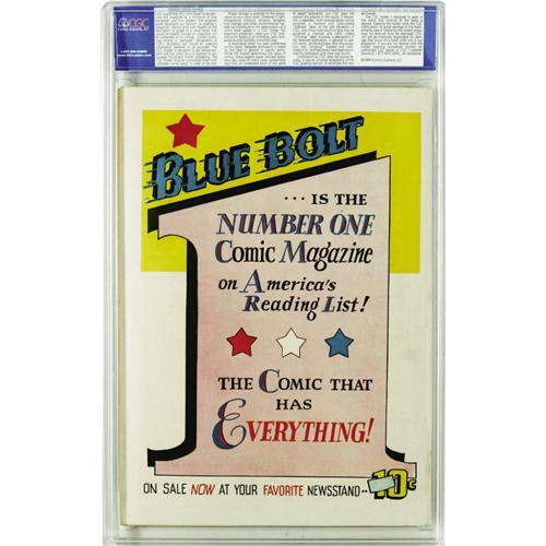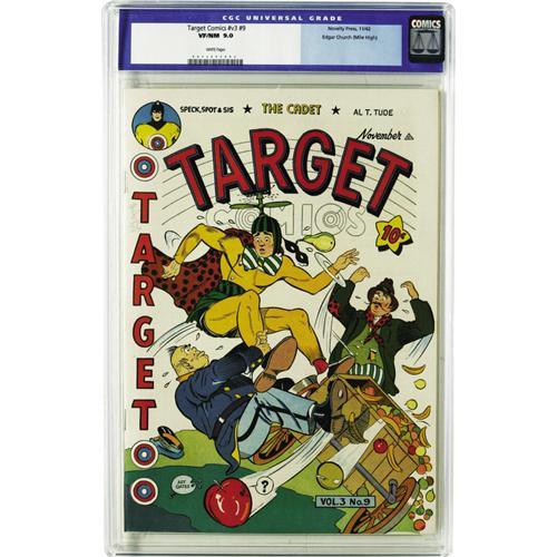 <B>Target Comics V3#9 Mile High pedigree (Novelty Press, 1942) CGC VF/NM 9.0 White pages.</B></I> Superheroes had only been around a few years by 1942, and already superhero parodies were appearing. Take this issue's coverboy Al T. Tude... please! Basil Wolverton's Spacehawk also appears in the issue. This copy's got a fantastic white cover and perfect page quality, if not for a minor bug-induced hole in the spine, this book would be firmly in the 9.4-and-up category, so don't miss it. Overstreet 2006 VF/NM 9.0 value = $555; NM- 9.2 value = $760. CGC census 6/06: 1 in 9.0, none higher. <BR><BR><B>Important notice:</B> Heritage usually auctions material at the rate of 200-250 lots per hour. On some occasions eBay Live bid software or the Internet may not be able to keep up with the pace of the auction. We recommend placing a realistic absentee bid now as insurance to avoid disappointment. Occasionally the auctioneer may eliminate or reject an eBay Live bid, and the auctioneer may also reopen a lot after the close of the eBay live bidding (usually because we missed an audience bid), and may reject your bid even if it shows you as the winning bidder. By bidding via eBay Live, you agree that Heritage may award the lot to another bidder at its sole discretion under the circumstances described above or any other reasonable circumstances. Since eBay bids are not shown to us until we open the lot on the floor, we treat those bids just like floor bids. In most cases the floor responds before the eBay bid is presented to us, due to Internet lag time, so for consistency we have made it a policy that floor bids are always considered first over tie eBay live bids. Also please note that all Heritage lots purchased through eBay Live carry a 22.5% Buyer's Premium. Please make sure you read the Terms and Conditions before you bid. This lot is being auctioned in conjunction with a live floor auction by Heritage Auction Galleries. All final auction and invoice information will be supplied by Heritage Auction Galleries, and all other information should be considered preliminary. Lot:41001 <BR><BR><B>Winning Notification and Billing:</B> After the FINAL session in this auction is complete, Heritage will send e-mail and snail mail invoices. This process normally takes several days. All final auction and invoice information will be supplied by Heritage Auction Galleries, and all other information should be considered preliminary. <BR><BR>This auction will be conducted on a live auction floor and over the Internet through eBay Live. If you choose to place an absentee bid, please take a moment to <font color='#0000ff'><u><a href='http://pages.ebay.com/liveauctions/help/before/laabsentee.html'>learn how eBay Live absentee bidding works</a></u></font><font color='#000000'>