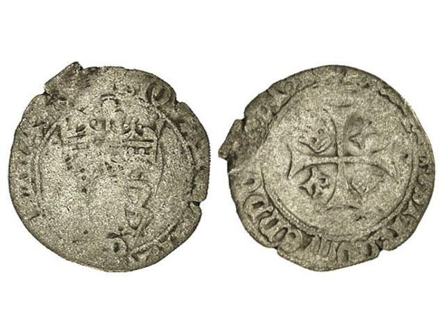 Tarja. CATALINA y JUAN. Anv.: ¶:IOHANES:ET:K(AT)ERINA:R. IK coronadas entre dos circulitos, debajo P. Rev.: ¶:SIT:NOMEN DOMINI(...). Cruz, en espacios: I - corona - K - corona. 1,43 grs. Ve. Cru.VS-292 sim.; IBL-No cat. BC+.