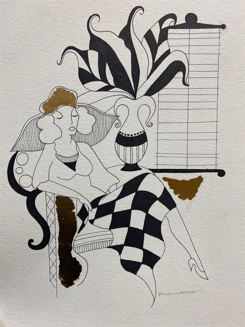 Tarkay Lady 3 by Del Mar, Paulina. Original One-of-a-Kind Hand Signed Pen and Ink. Dimensions: 15 x 11. Excellent Condition.