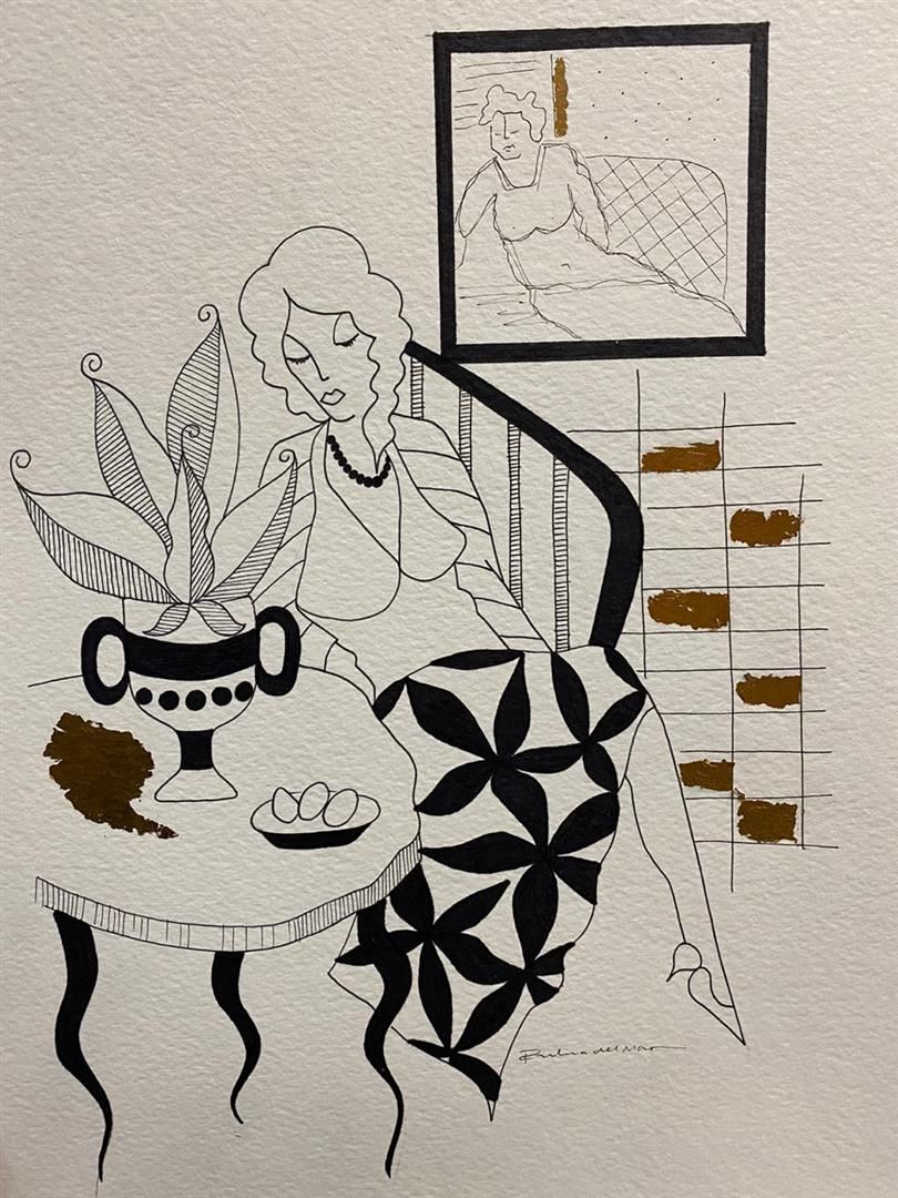 Tarkay Lady 4 by Del Mar, Paulina. Original One-of-a-Kind Hand Signed Pen and Ink. Dimensions: 15 x 11. Excellent Condition.