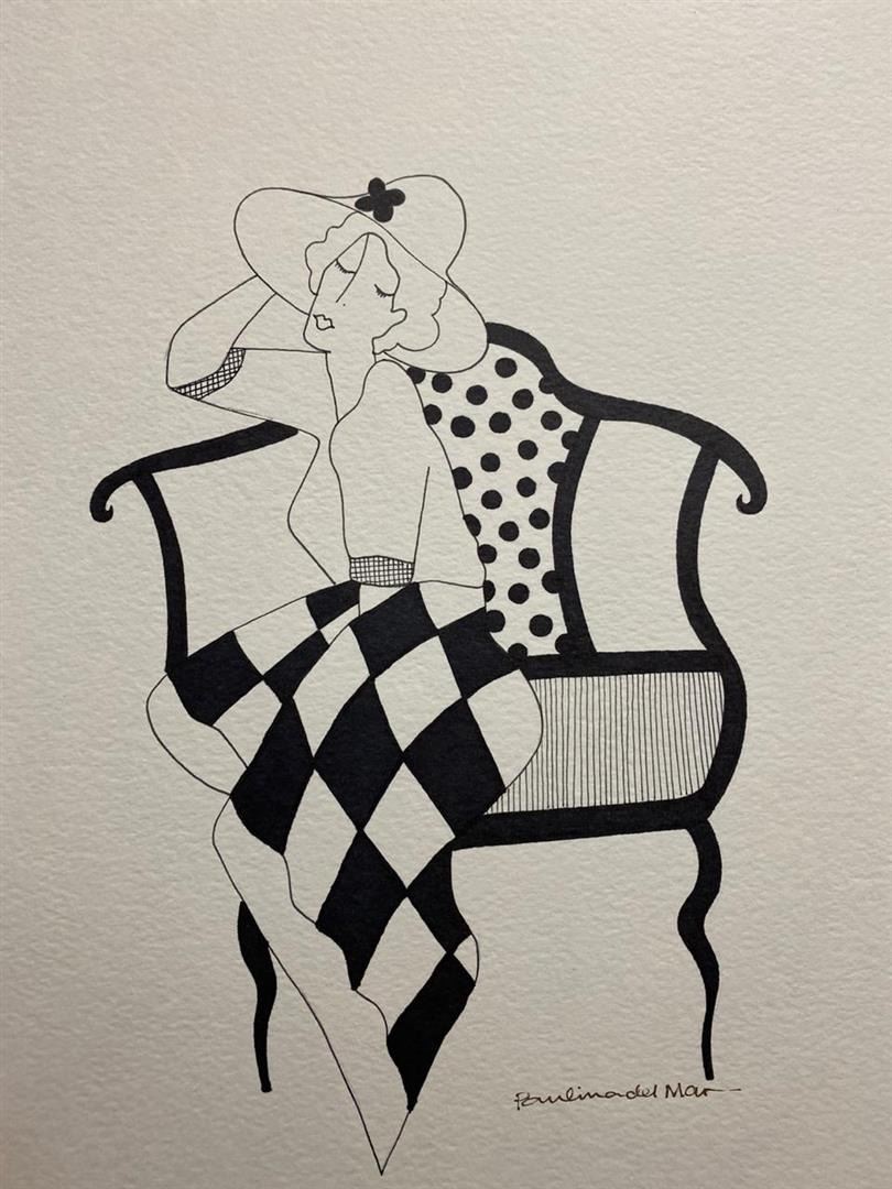 Tarkay Lady 9 by Del Mar, Paulina. Original One-of-a-Kind Hand Signed Pen and Ink. Dimensions: 15 x 11. Excellent Condition.