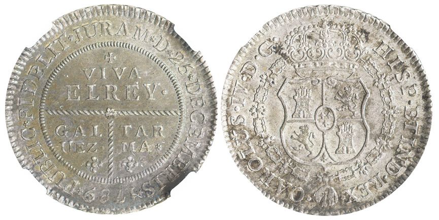 Tarma (Galuez), Peru, silver 8R-sized proclamation medal, Charles IV, 1789, encapsulated NGC MS 61. Medina-269. 36mm. Obverse with Spanish arms, king's name and titles in legend; reverse with tripartite VIVA / EL REY, GAL / UEZ and TAR / MA within legend PUBLIC FIDELIT JURAM D 25 DECEMBRIS 1789. Richly toned (somewhat spotty on obverse), with ample luster.