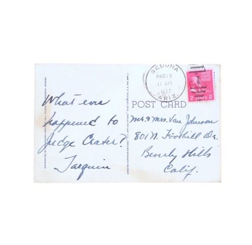 Tarquin Olivier Handwritten Postcard - Tarquin Olivier was the first child of the world's greatest actor, Laurence Olivier, with his first wife actress Jill Esmond. He became a producer and director in his own right, including the definitive bio on his father. Having inherited his wit and charm from his famous father, Tarquin was the darling of the International celebrity set, even at a young age. This is an extremely rare handwritten postcard from the then 16 year old Tarquin, written to actor Van Johnson and his wife, who were close friends of the Olivier's. Tarquin has written a familiar 'catch phrase" of the time (actually from an early era, and he most likely got it from his father): "What ever happened to Judge Crater?". And it is signed "Tarquin". It was a way of saying to a friend you haven't talked to in awhile: "Hey, so, how's it going, what's new?" The reference was to Joseph Crater, a Justice of the New York Supreme Court who disappeared in 1930 while out for dinner in New York. He was never found, and was known as "The missingest Man in New York". The rare postcard which shows a baby donkey "feeding" on its mother, is postmarked March 19, 1952 from Sedona, Arizona and includes the original cancelled two-cent stamp. This comes directly from Van Johnson's personal collection, and includes a Letter of Provenience from the Johnson’s daughter, Schuyler Johnson along with a copy of her famous controversial cover story article “My Life As A Hollywood Princess”, about her trials and tribulations growing up in Beverly Hills with a superstar father and extended “family” with some of the most famous celebrities in the world.