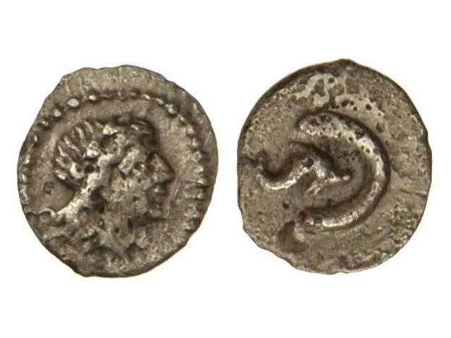 Tartemorion. - Siglo III finales a.C. - DIVISORES INCIERTOS. - Anv.: Cabeza de Apolo laureada a derecha. Rev.: Creciente, en su centro delfín. 0,20 grs. AR. Vill-7. (MBC+). - -