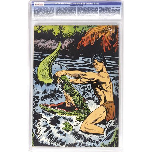 <B>Tarzan #1 Davis Crippen ("D" Copy) pedigree (Dell, 1948) CGC VF/NM 9.0 Off-white pages.</B></I> Here's the start of a run that took the Lord of the Jungle through 258 issues, three publishers, and almost 30 years. Jesse Marsh drew the cover and provided interior art. Overstreet 2006 VF/NM 9.0 value = $1,354; NM- 9.2 value = $1,900. CGC census 6/06: 1 in 9.0, 1 higher. <I>From the Crippen Collection.</B></I> <BR><BR><B>Important notice:</B> Heritage usually auctions material at the rate of 200-250 lots per hour. On some occasions eBay Live bid software or the Internet may not be able to keep up with the pace of the auction. We recommend placing a realistic absentee bid now as insurance to avoid disappointment. Occasionally the auctioneer may eliminate or reject an eBay Live bid, and the auctioneer may also reopen a lot after the close of the eBay live bidding (usually because we missed an audience bid), and may reject your bid even if it shows you as the winning bidder. By bidding via eBay Live, you agree that Heritage may award the lot to another bidder at its sole discretion under the circumstances described above or any other reasonable circumstances. Since eBay bids are not shown to us until we open the lot on the floor, we treat those bids just like floor bids. In most cases the floor responds before the eBay bid is presented to us, due to Internet lag time, so for consistency we have made it a policy that floor bids are always considered first over tie eBay live bids. Also please note that all Heritage lots purchased through eBay Live carry a 22.5% Buyer's Premium. Please make sure you read the Terms and Conditions before you bid. This lot is being auctioned in conjunction with a live floor auction by Heritage Auction Galleries. All final auction and invoice information will be supplied by Heritage Auction Galleries, and all other information should be considered preliminary. Lot:41001 <BR><BR><B>Winning Notification and Billing:</B> After the FINAL session in this auction is complete, Heritage will send e-mail and snail mail invoices. This process normally takes several days. All final auction and invoice information will be supplied by Heritage Auction Galleries, and all other information should be considered preliminary. <BR><BR>This auction will be conducted on a live auction floor and over the Internet through eBay Live. If you choose to place an absentee bid, please take a moment to <font color='#0000ff'><u><a href='http://pages.ebay.com/liveauctions/help/before/laabsentee.html'>learn how eBay Live absentee bidding works</a></u></font><font color='#000000'>
