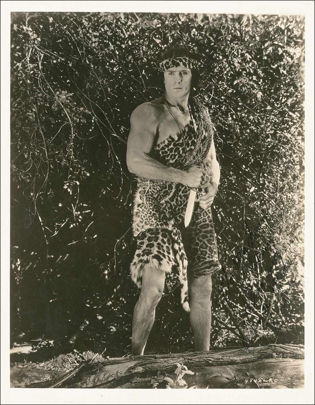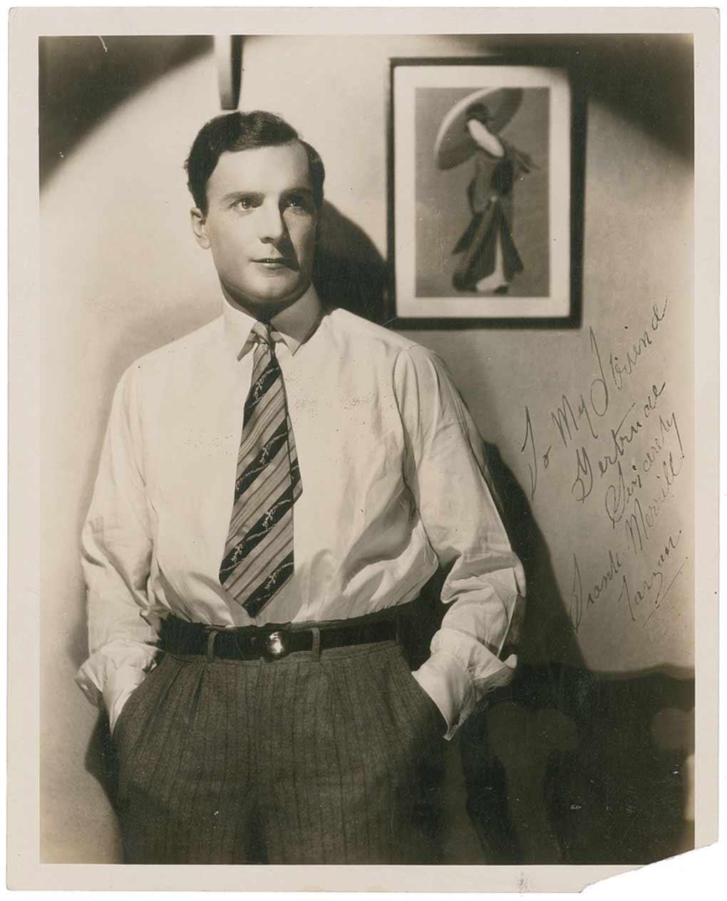 Fifth actor to portray Tarzan on film (1893-1966). He worked as a stuntman, doubling for Elmo Lincoln in the 1921 Adventures of Tarzan. His first starring role was in Perils of the Jungle; the director of that movie offered him the job of Tarzan when the man who already had the job (Joe Bonono, already billed as "the greatest of all Tarzans") fractured his leg and broke his contract. Merrill invented the vine-swinging techniques used in later Tarzan films and the Tarzan yell, played on a record accompanying a "semi-sound" version of this second Tarzan movie. Ironically, his voice was thought unsuitable for talkies and he retired from film. Vintage glossy 8 x 10 photo of Merrill in a shirt and tie, signed and inscribed in fountain pen “To my friend Gertrude, Sincerely, Frank Merrill, Tarzan.” Accompanied by a vintage unsigned photo of Merrill as Tarzan. In very good condition, with missing lower right corner tip, signature and inscription a shade light, and scattered silvering to darker areas of image and background.