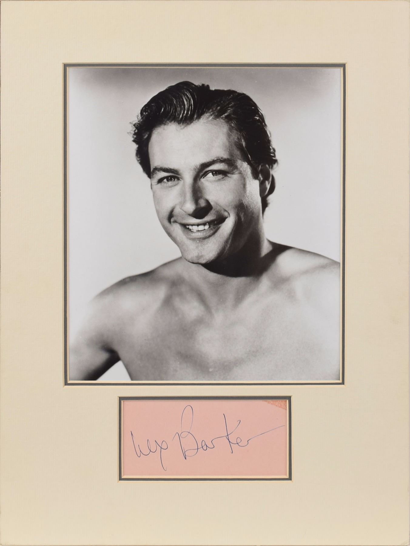 Six items: an ink signature of Johnny Weissmuller on an orange 3.25 x 3 sheet, matted with a photo of Weissmuller as Tarzan; a pair of ink signatures of Lex Barker on off-white slips, 3.75 x 1.5 and 4.75 x 2.25, both are individually matted with photos of the actor as Tarzan; a semi-glossy 11 x 14 photo of Steve Reeves as Hercules, signed in black felt tip by Reeves; a semi-glossy 11 x 14 photo of Gordon Scott as Tarzan, signed in black felt tip by Scott; and a copy of Tarzan of the Movies, hardcover with dust jacket, featuring a set of six 5 x 3 cards affixed to the inside front cover and first free end page, individually signed in various ink types by Bruce Bennett, Nancy Kovacks, Denny Miller, Ron Ely, Julie Harris and Maureen O’Sullivan (clipped), and signed on the half-title page in felt tip by Gordon Scott and Clarence Swenson. In overall very good to fine condition.