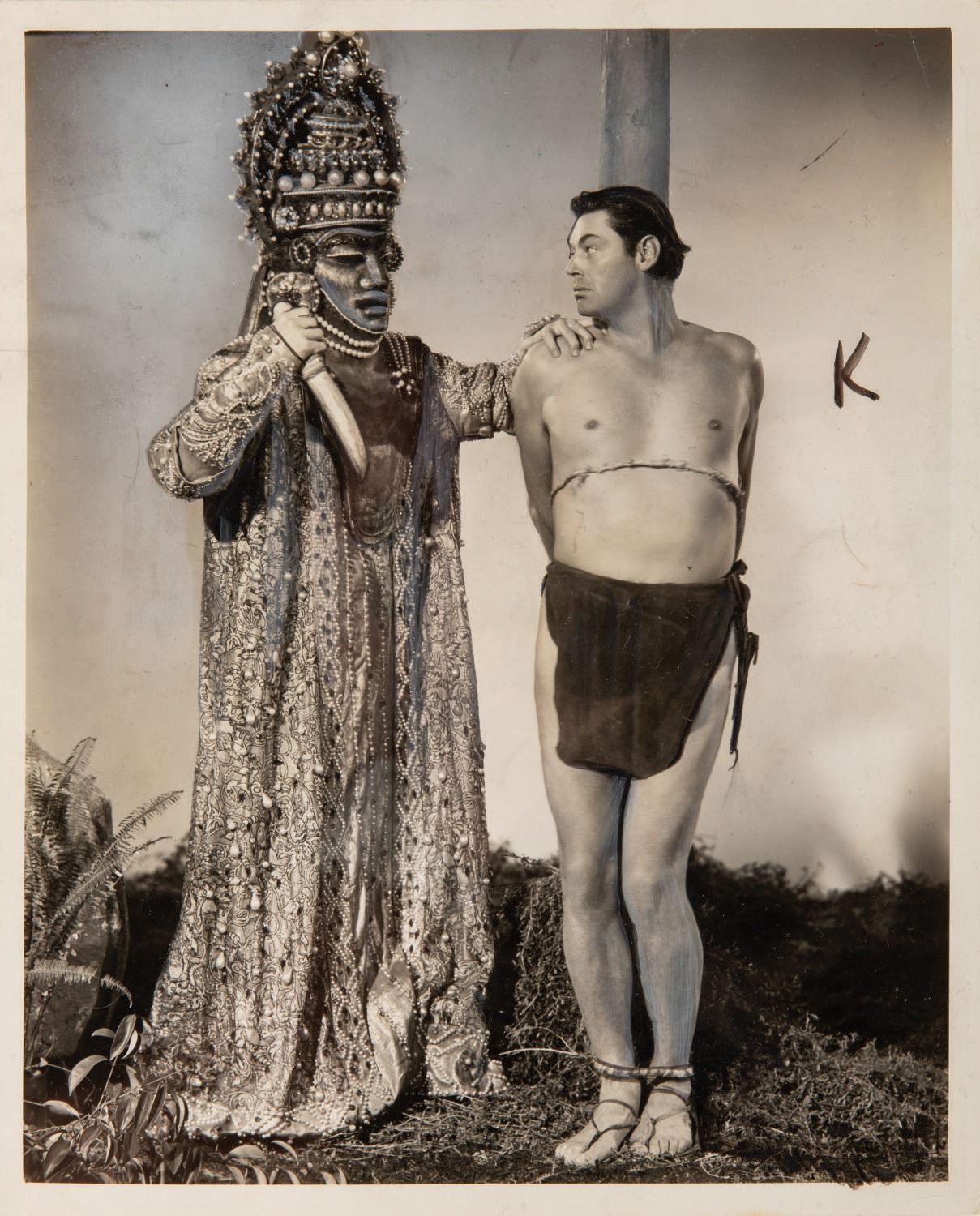 (RKO, 1948) A promotional publicity photo for "Tarzan and the Mermaids." The photo depicts Tarzan (Johnny Weissmuller) trapped by the film's villain Palanth (George Zucco). The photo has been touched up with paint, a common practice during this era. Measuring approximately 10"x8", the photo is in good condition, despite some annotation, minor creases and wear to edges and corners.