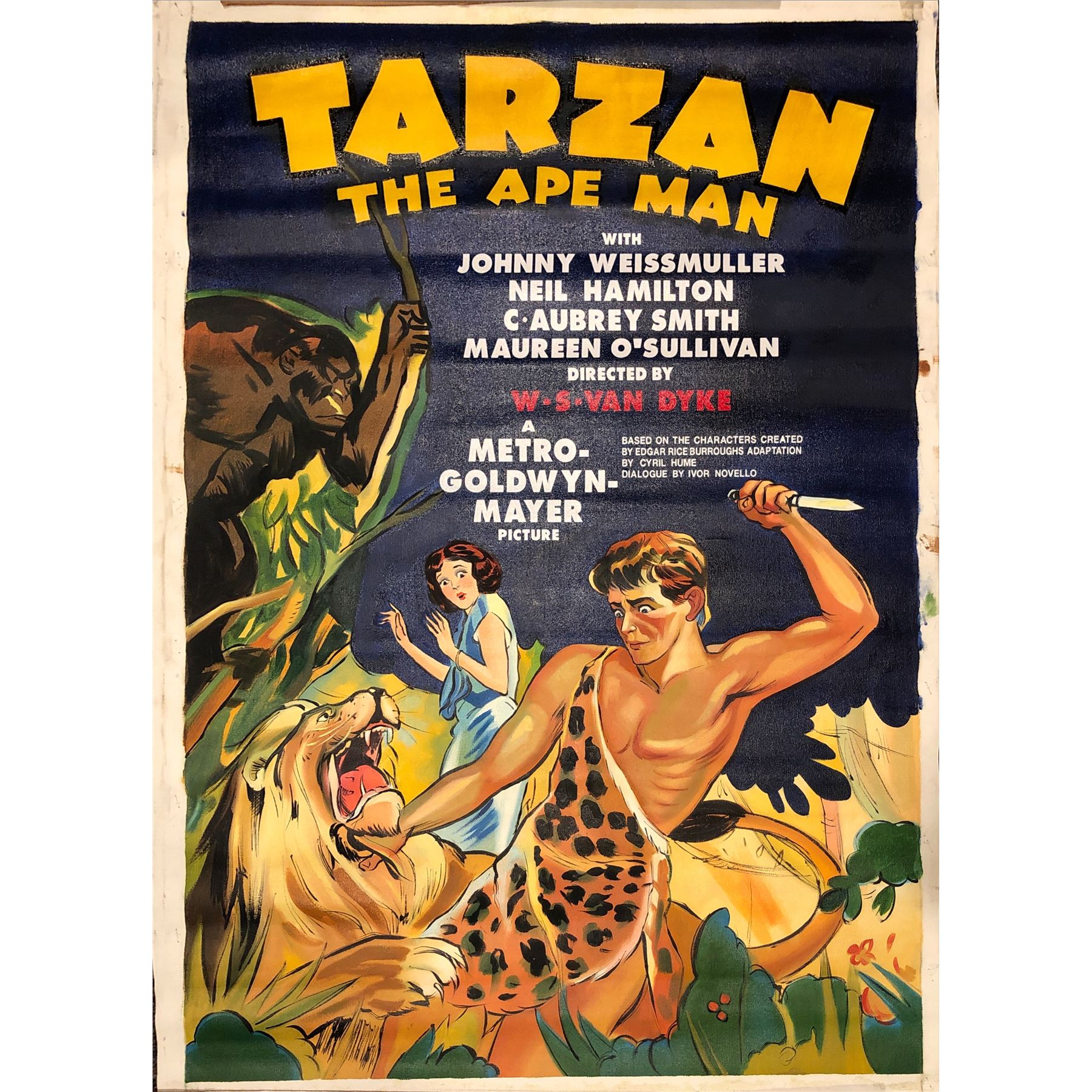 Tarzan the Apeman original 1932 vintage linen backed original oil on canvas. 27X41 Inches