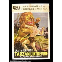 Tarzan the Fearless (Principal Distributing 1933) Belgium. Pretty stone litho poster produced overseas for the Buster Crabbe film. Very Fine, Folded. Important notice: We expect to be auctioning lots at the rate of 200-250 per hour. Sometimes eBay Premier live bid software cannot keep up with that pace, so we strongly recommend that you place a realistic proxy bid now as insurance to avoid disappointment. Also please note that all Heritage/CAA lots purchased through eBay Premier carry a 20% Buyer's Premium.