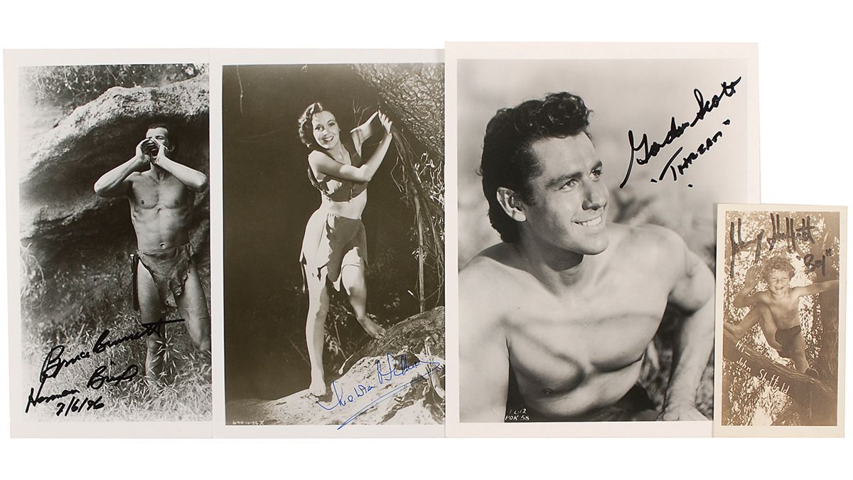 Four photos: three glossy 8 x 10 photos, signed in blue or black felt tip by Gordon Scott, Maureen O’Sullivan, and Bruce Bennett respectively, with Bennett adding “Herman Brix 7/6/96,” underneath; and a matte-finish 3.25 x 6 photo of a young Johnny Sheffield, signed in black felt tip. In fine condition.