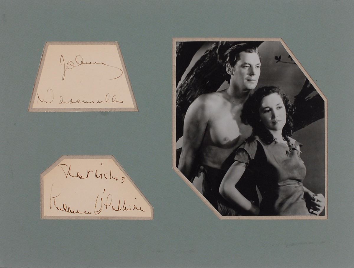 Two ink signatures, “Johnny Weissmuller” and “Best wishes, Maureen O’Sullivan,” on individual off-white sheets, approximately 4.5 x 2.5. Both are double-matted with an image of the pair to an overall size of 16 x 12. In overall fine condition, with slight feathering and irregular ink adhesion to the O’Sullivan, and a small crease to the Weissmuller.