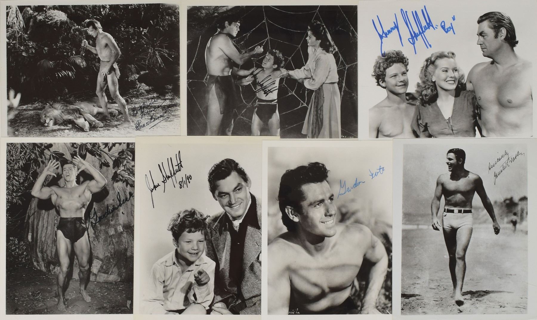 Group of seven glossy photos, approximately 8 x 10 or 10 x 8, each signed in felt tip by an actor from the Tarzan film series, including: Buster Crabbe, Gordon Scott (2), Bruce Bennett (ins), and John Sheffield (3). In overall fine condition.