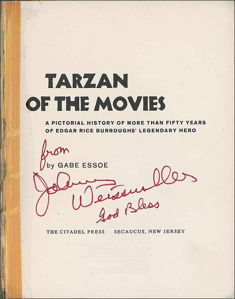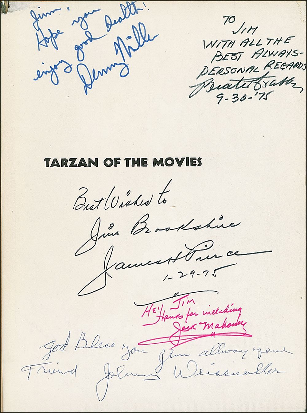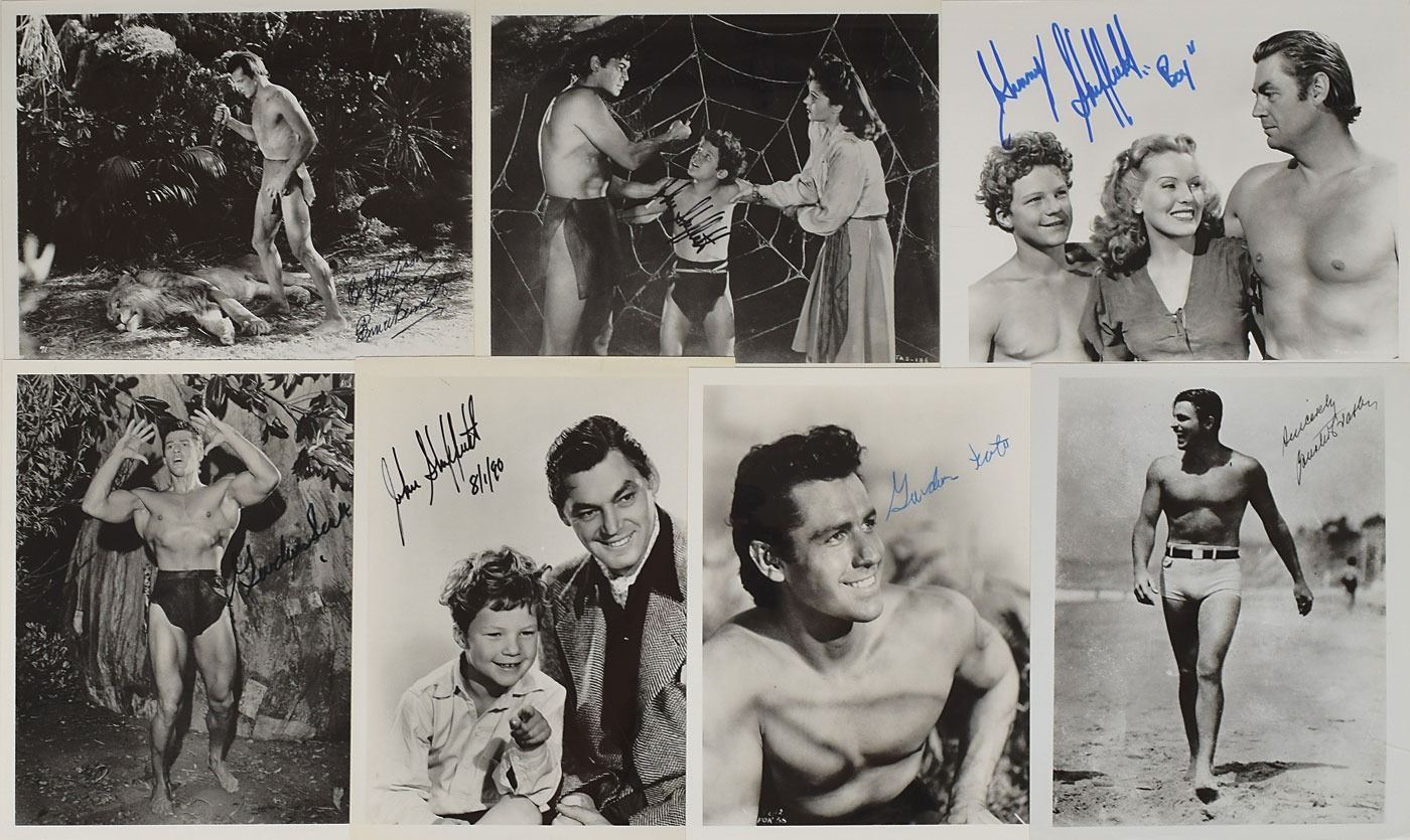 Impressive collection of Tarzan autographs, including: thirteen glossy photos, approximately 8 x 10 or 10 x 8, each signed in ink by an actor from the Tarzan film series, with a few inscribed, including: Buster Crabbe (2), Gordon Scott (4), Bruce Bennett (2), and Johnny Sheffield (5). Plus a signed book: Tarzan of the Movies by Gabe Esoe. Later printing. Secaucus, NJ: Citadel Press, 1973. Hardcover with dust jacket, 9 x 11, 208 pages. Signed and inscribed in various inks on the prefatory pages by Denny Miller, Buster Crabbe, James H. Pierce (twice, one on an inner full-page photo), Jock Mahoney, and Johnny Weissmuller (three times, one on a full-page photo). Photos in overall fine condition; book in very good condition, with light wear to jacket, light scattered toning and owner's label to endpapers, a chip to one signed page, and a few toned tape reinforcements (one to Weissmuller photo and signed page).