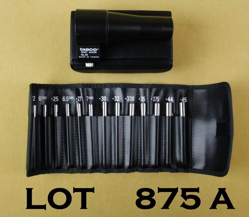 Tasco “Shot Saver” bore sight tool for scope alignment. Model #30/35E. Set includes bore rods in carrying case for .177, .22, 6mm, .25, 6.5mm, .27, .7mm, .30, .32, .338, .35, .375, .44, and .45 bore diameters. A complete set, new in box. Est: $25 - $50