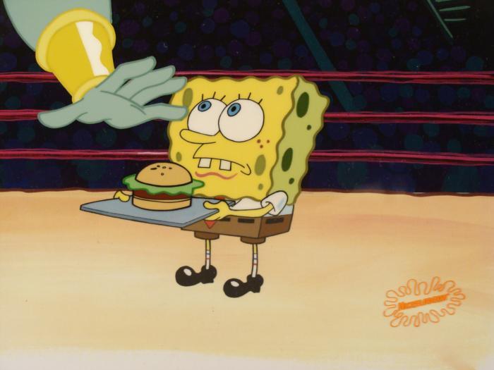 To create production cels, the original animator's drawing is transferred onto an acetate cel (by hand-inking and/or photo copying). The cel is then hand-painted on the reverse side. The background accompanying this set-up is a hand-painted original production background. The printed background is ready to be matted and framed. It is a colored background with a cel and has the animator's notations at the bottom of the background and the cel. The background is a printed reproduction background. There is some slight paint fade to SpongeBob's outline. There is some paint that was removed from one cel onto the next cel. The cel has multiple layers; first is King Neptunes arm/hand, then is the Krabby Patty, the third cel is SpongeBob's eyes, and finally the last cel is SpongeBob's body. There is a Nickelodeon TV logo on the bottom right of the cel.