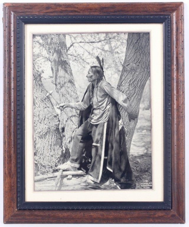 This is an original piece printed and published by Pittsburg Plate Glass Co and is of Tatanka Tamaheca otherwise known as Poor Bull. This image of the Native American was shot by Heyn in 1900. Herman Heyn was animportant portrait photographer in Omaha, Nebraska, from the 1880s through the 1920s. He is nationally noted for more than 500 images he created of Native Americans, mostly Sioux. This piece is in good condition. Theimage measures 9 3/8"x12 3/8" and the frame measures 14"x17"