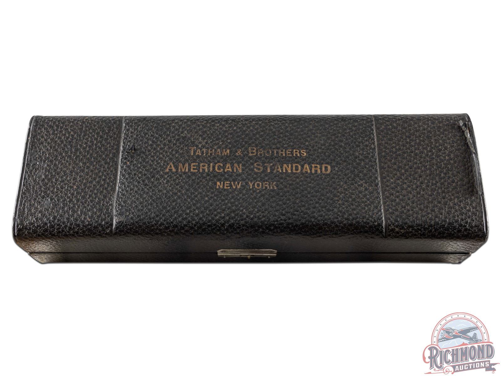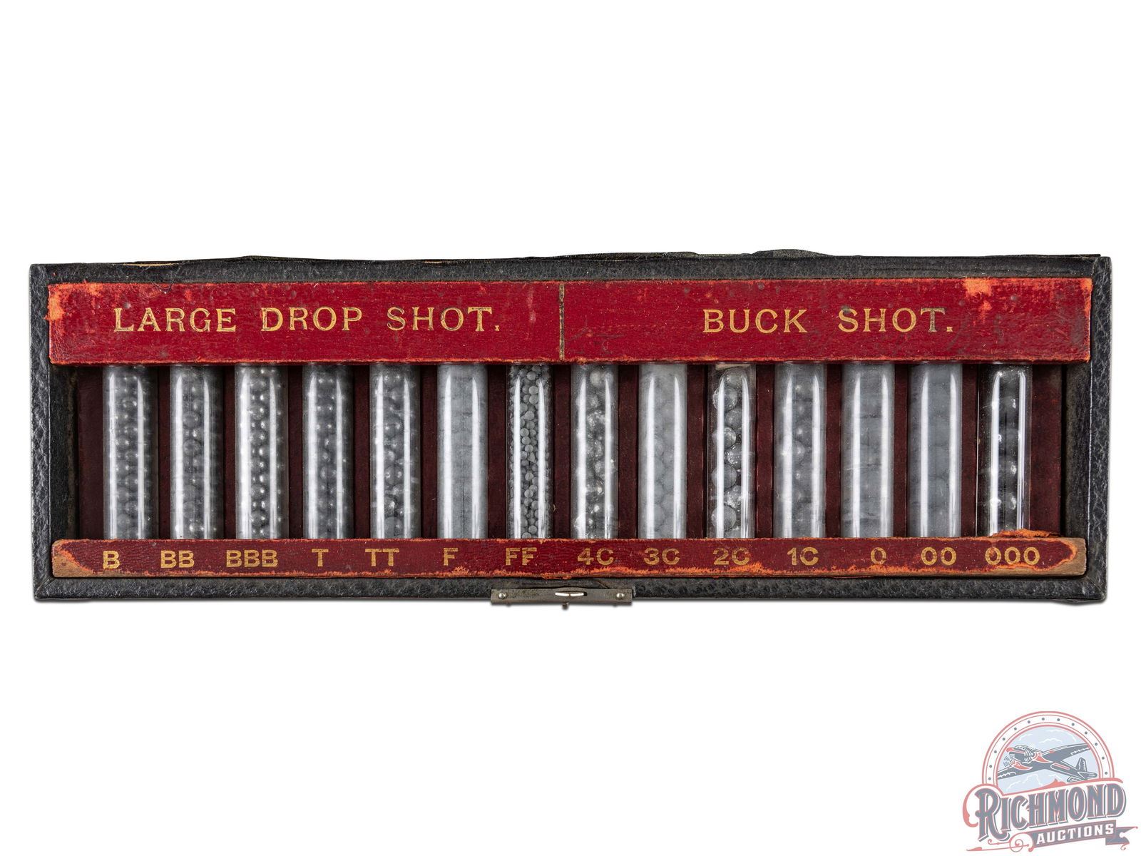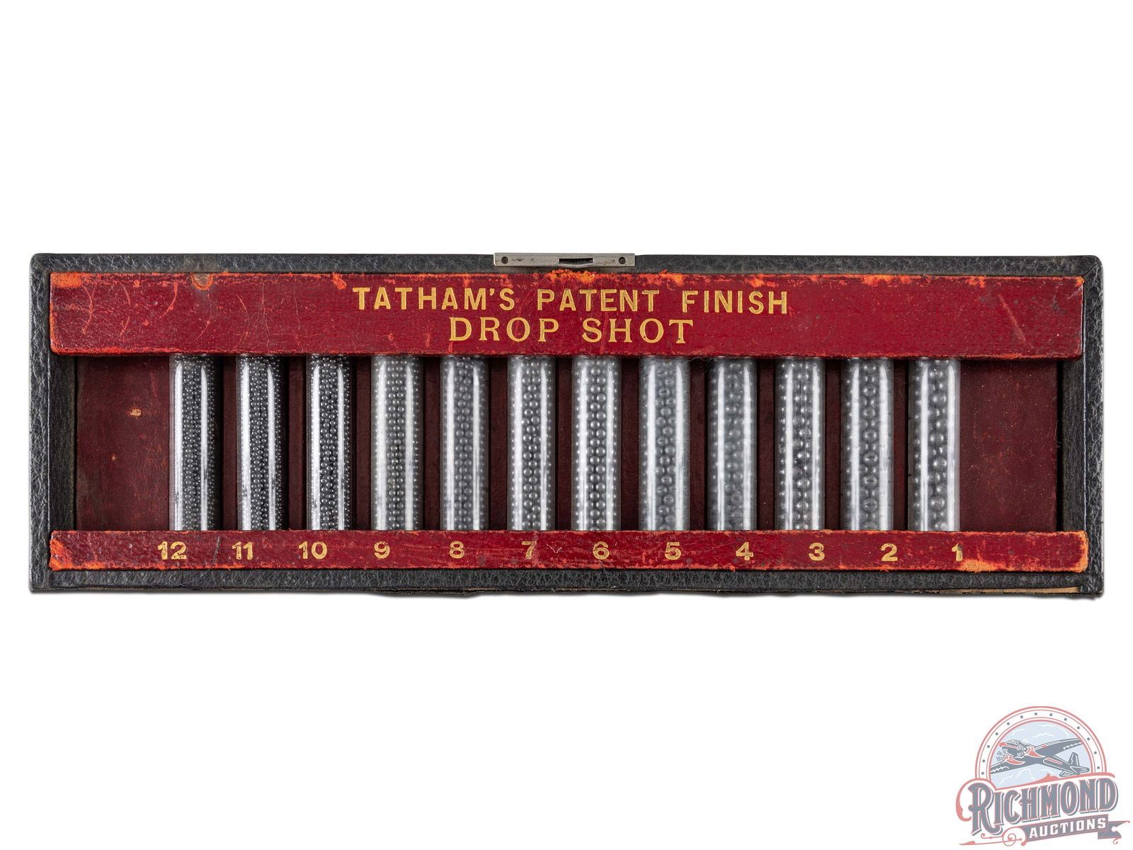 Vintage 1870 Tatham and Brothers of New York City Salesman kit with 26 vials of lead shot from "1" to "B" size. This company was once the major supplier for lead products until its demise 1907. Kit housed in a wood leather covered case with gilded "Tatham & Brothers/American Standard/New York" label. Inside kit has vials in gilded label red painted trays. A truly unique uncommon item that fits many collections.