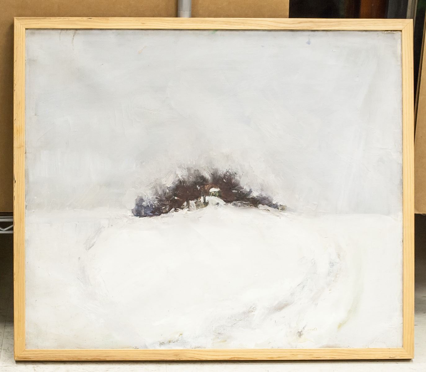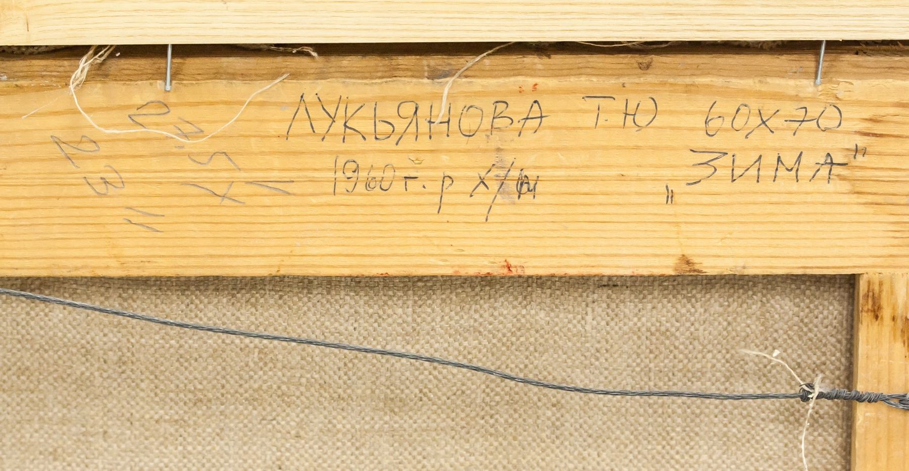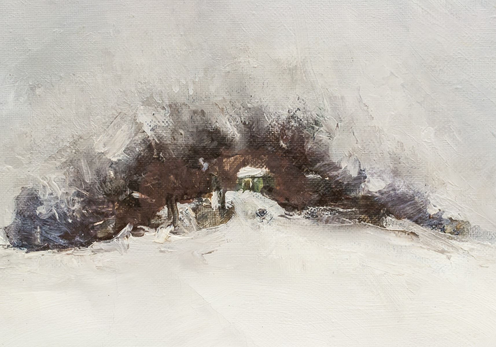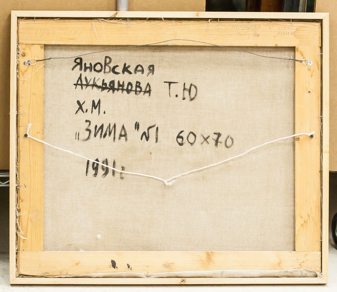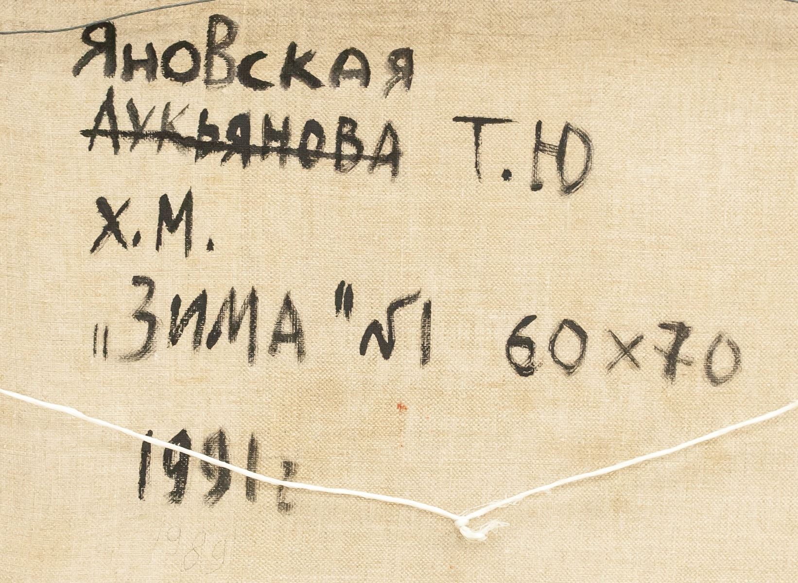 Oil on canvas, framed. Featuring snowy scene with a small house among trees in the distance. Inscribed on verso with Cyrillic script. "1991" inscribed on verso. By Tatiana Ianovskaia. 63 x 74 cm (24.75 x 29 in). Provenance: from the artist.