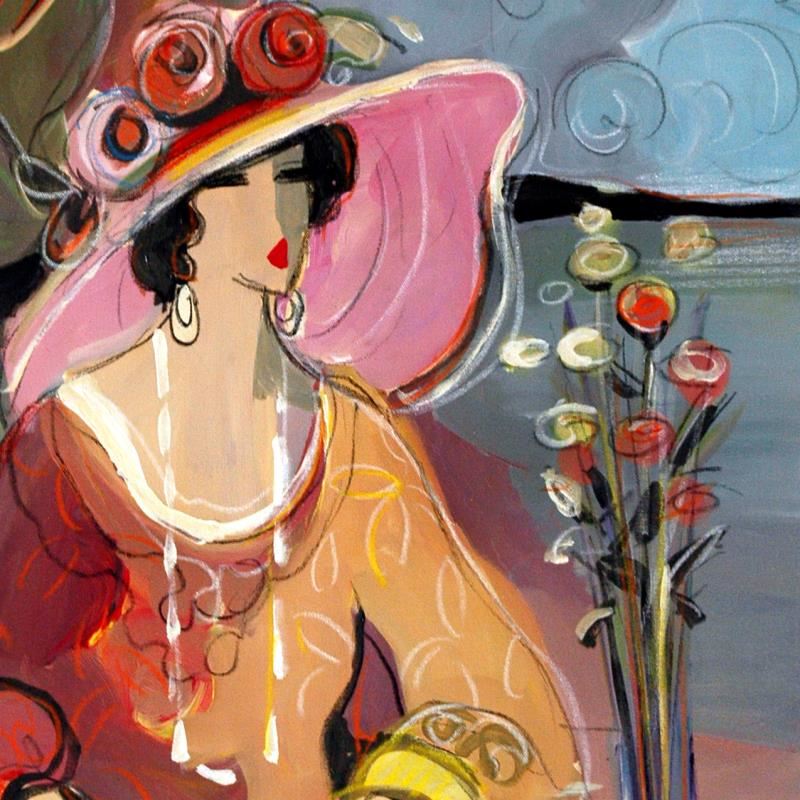 "Tatiana & The View" is an original acrylic painting on canvas by Isaac Maimon, hand signed by the artist and includes a certificate of authenticity. Measures approximately 30" x 24"