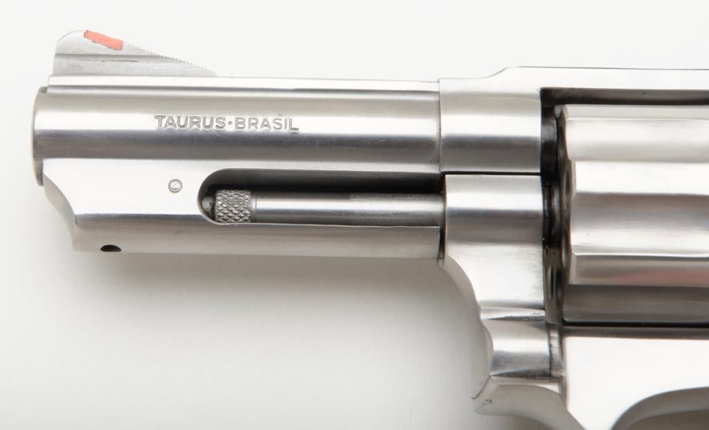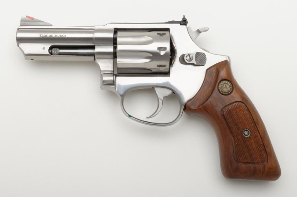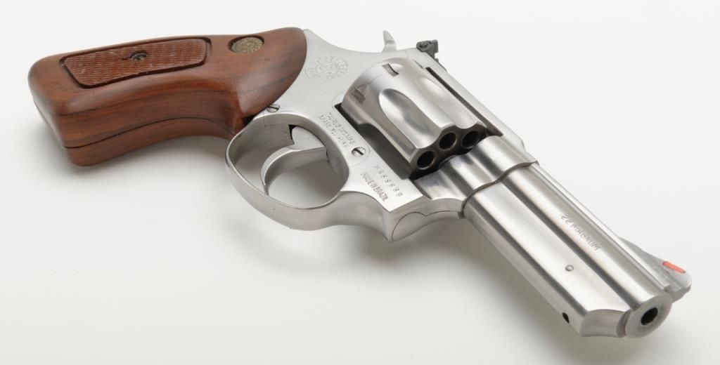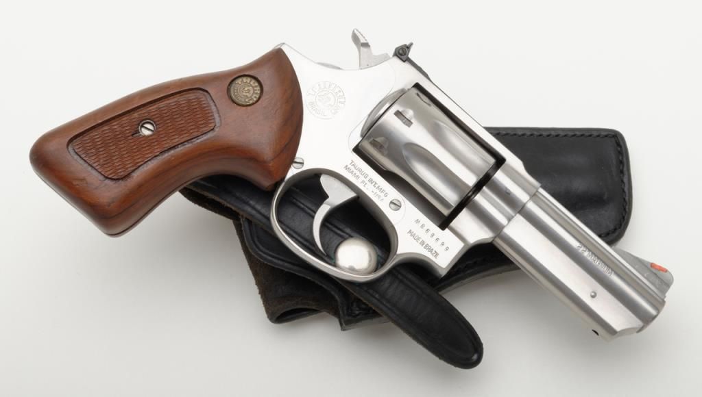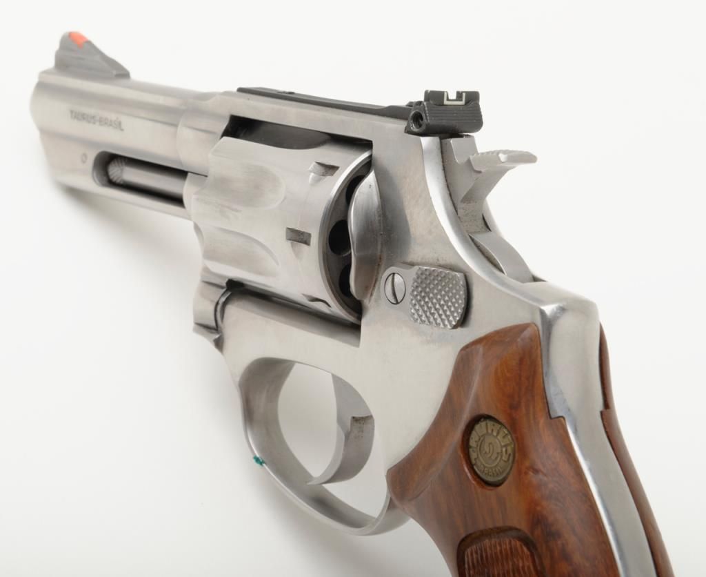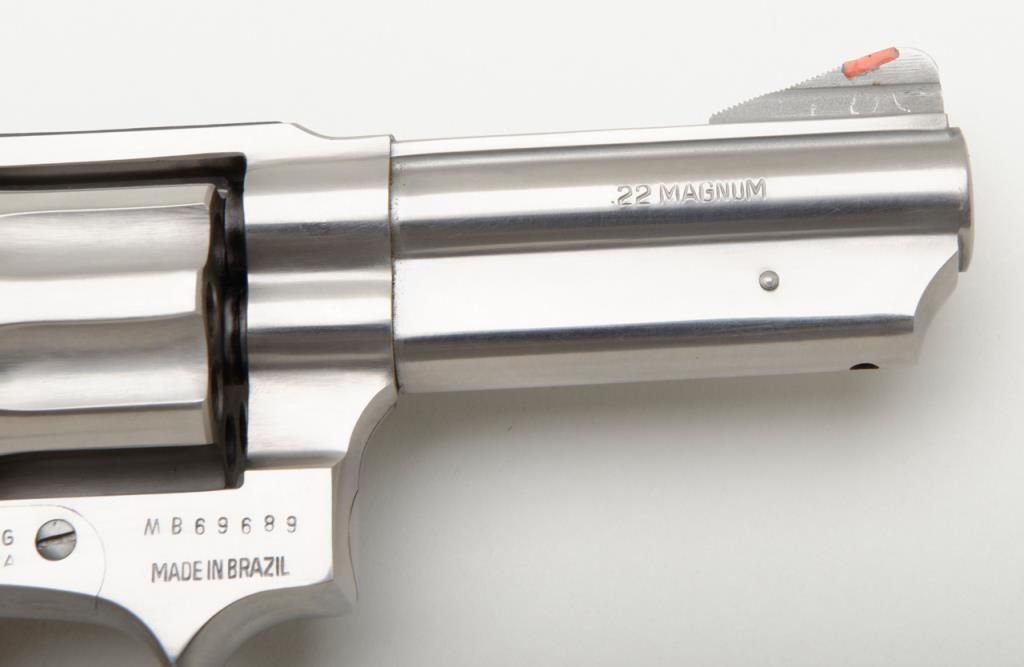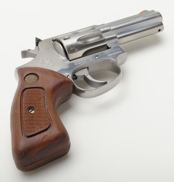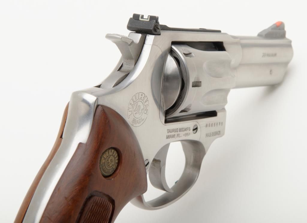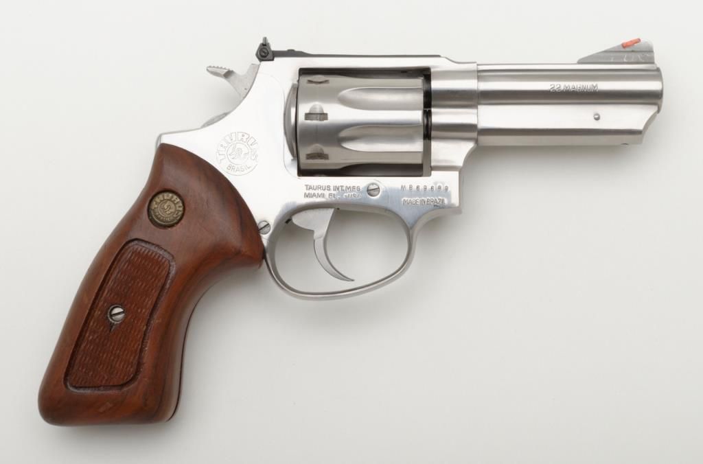 Taurus .22 Magnum double action stainless steel revolver with 3” barrel, serial number MB69689. The revolver shows white outline rear sight and red ramp front sight along with compressed wood grips. The condition is near fine used condition. Showing some firing and use. Est.: $150-$300
