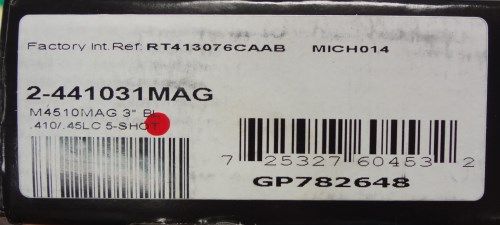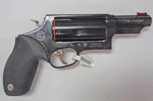 Taurus 45-410 Jude Revolver 45LC/410 Gauge. Finish- Blue, Action- Double, Stock- Rubber Grip, Capacity-5, Chamber- 3", Safety- Taurus Security System, Transfer Bar, Sights- Front: Red Fiber Optic Rear: Notched, Barrel Length- 3", Overall Length- 9.5", Weight- 29 oz, Features- "The Judge" Stamped on the Barrel. EST. $440-510.