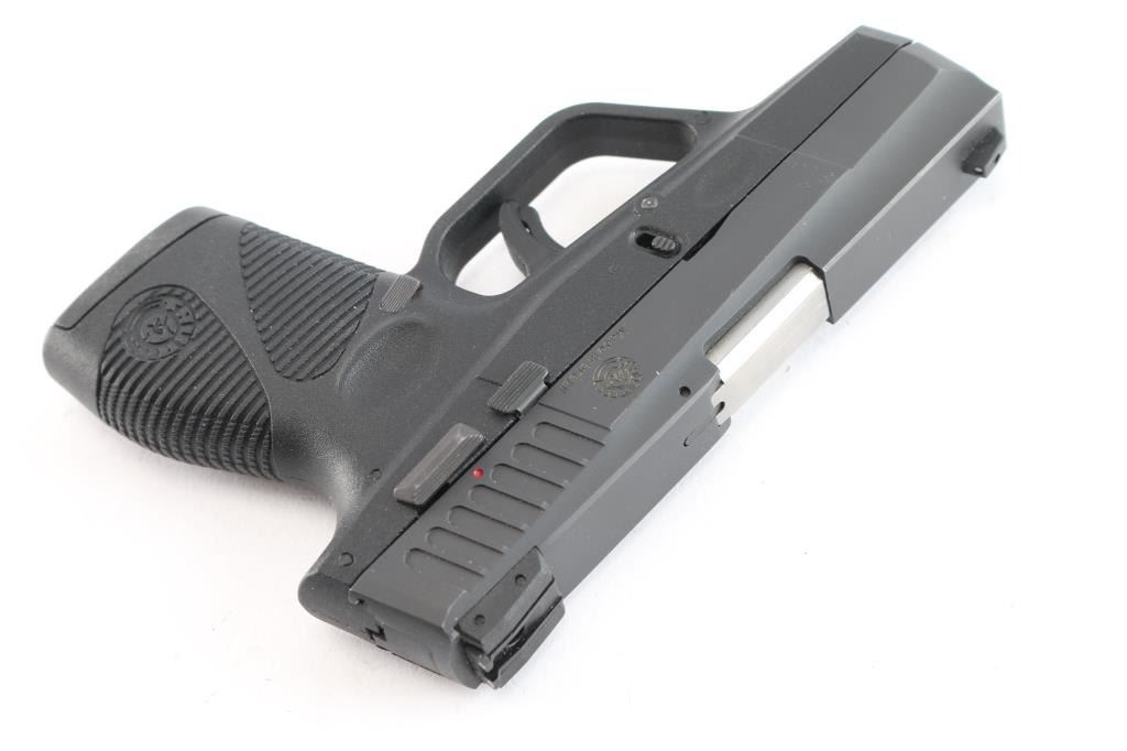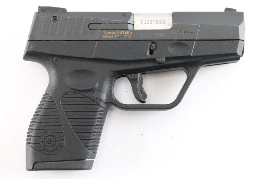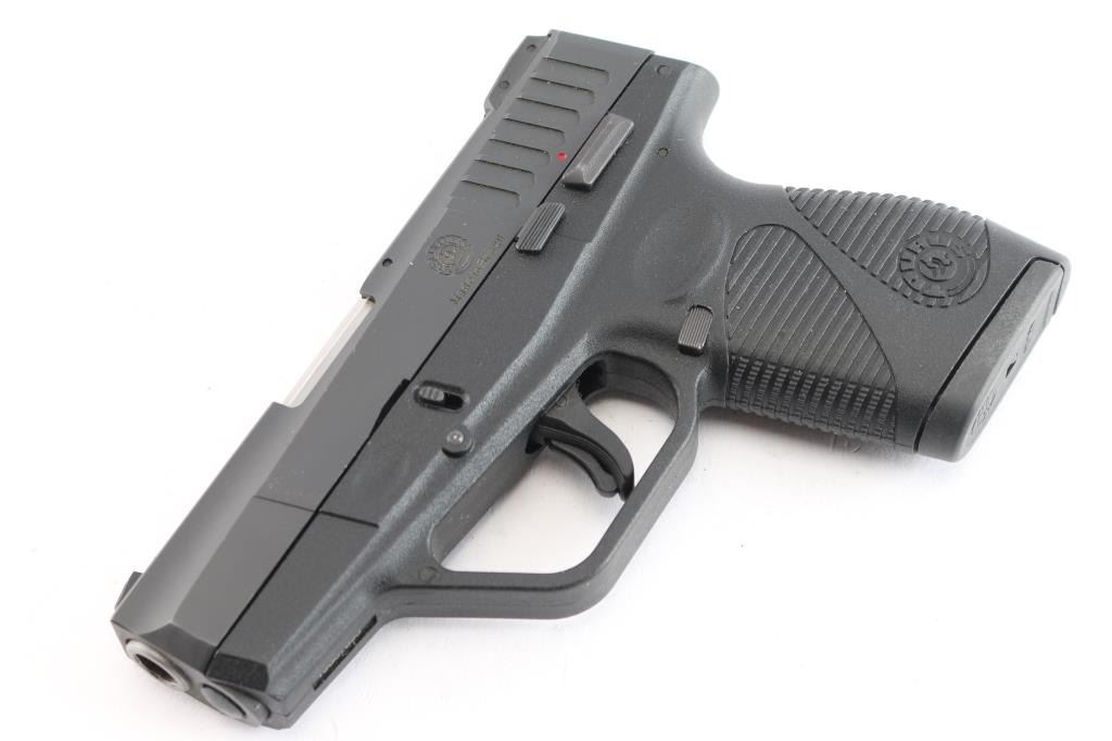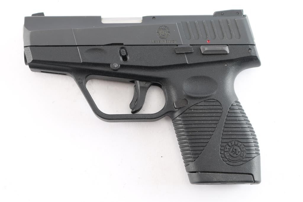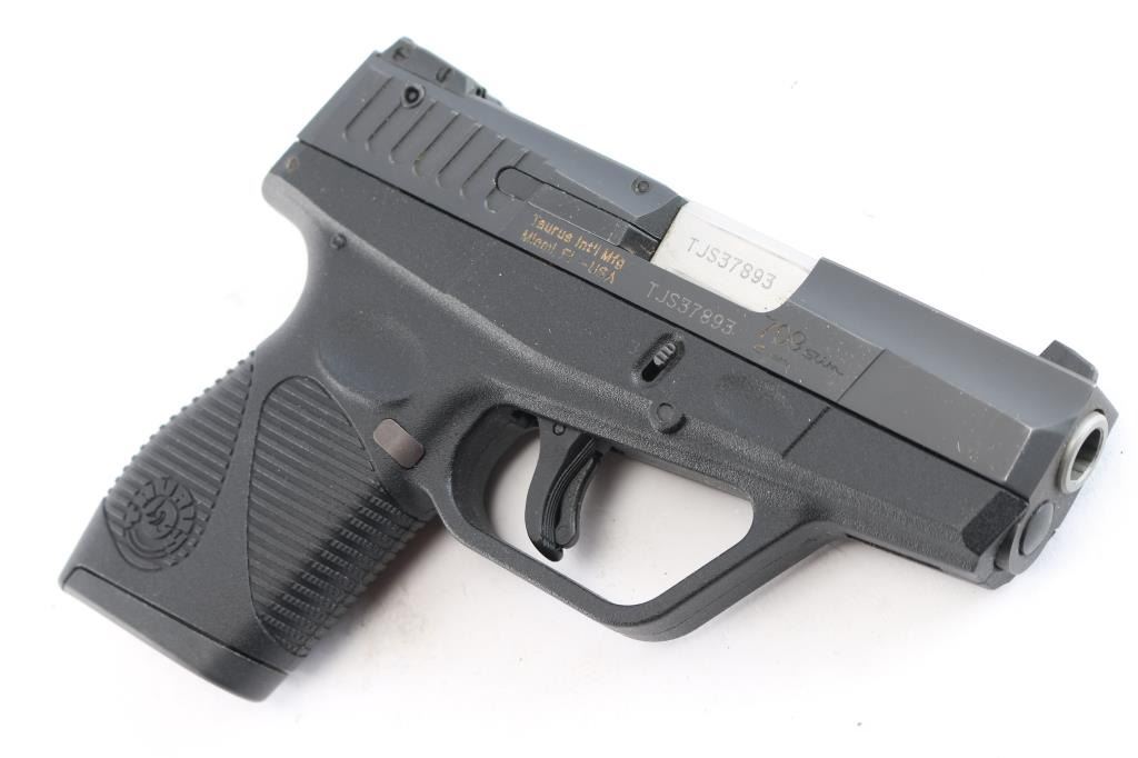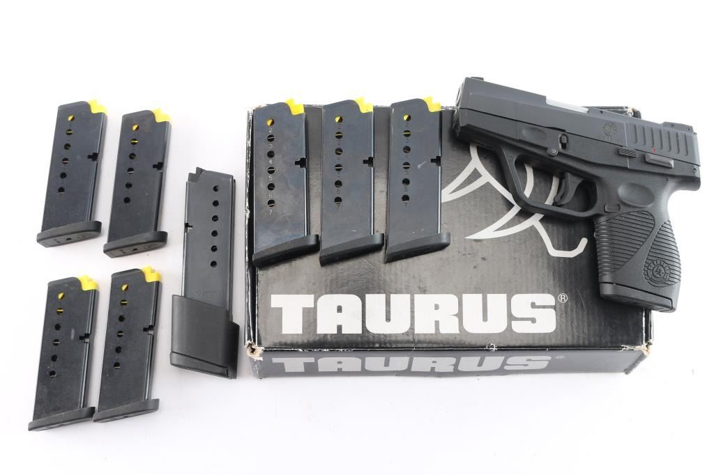 Compact semiautomatic pistol made in Brazil. Features 3.25" barrel, 3 dot sights with adjustable rear, frame mounted manual safety, pushbutton mag release, Taurus locking system in slide, trigger safety, loaded chamber indicator, matte black finish, polymer frame. Double action only trigger with restrike. Bore is very good bright condition. Retains 98% finish with edge wear. Includes factory box with matching label, two Taurus Locking System keys (also used to adjust sights), seven factory 7-rd magazines, 0ne Pro-Mag extended magazine, (8) total.
