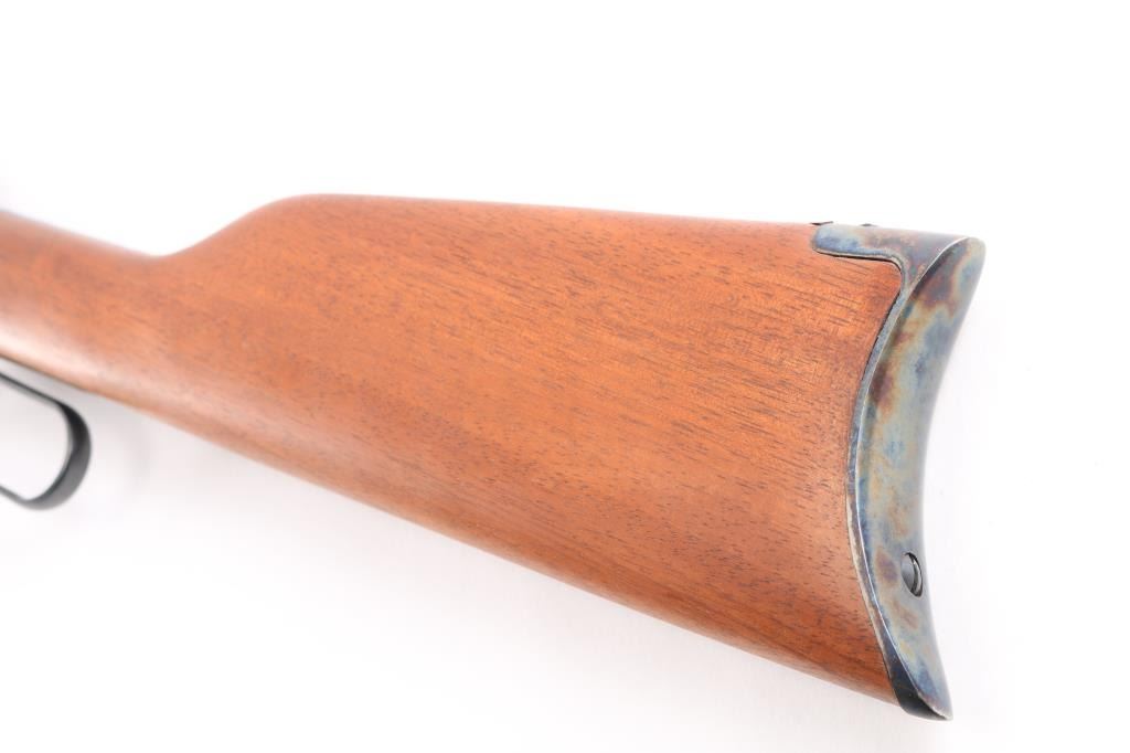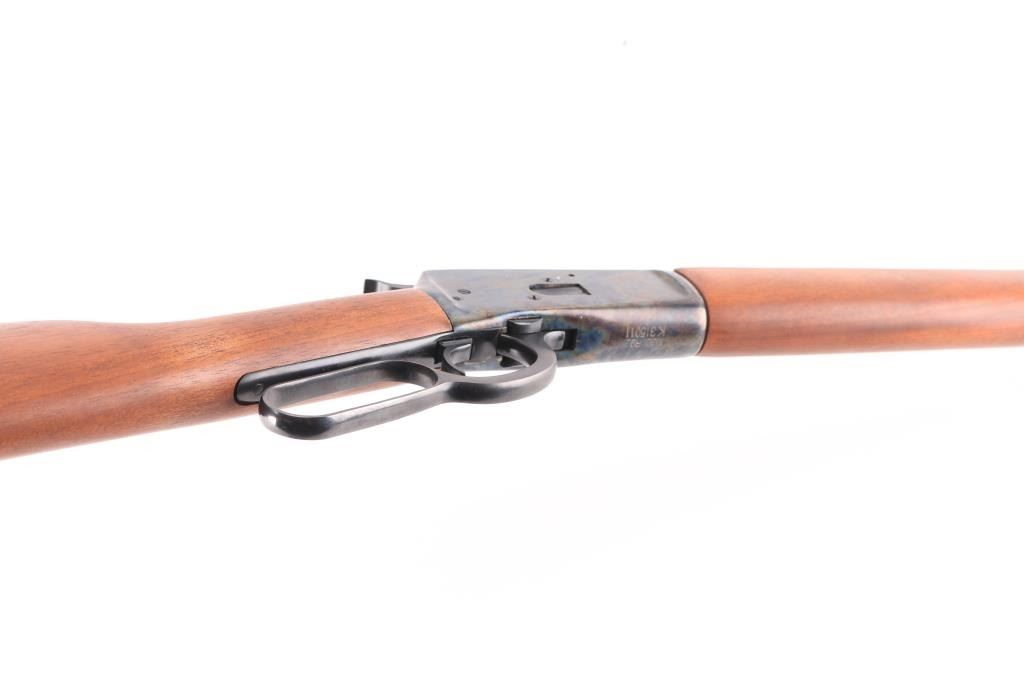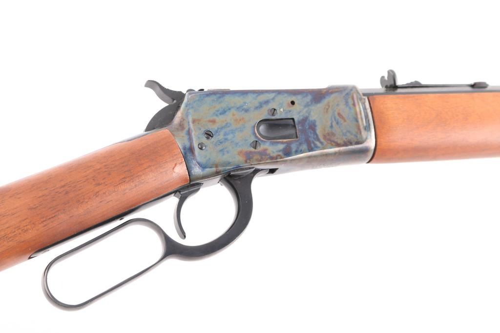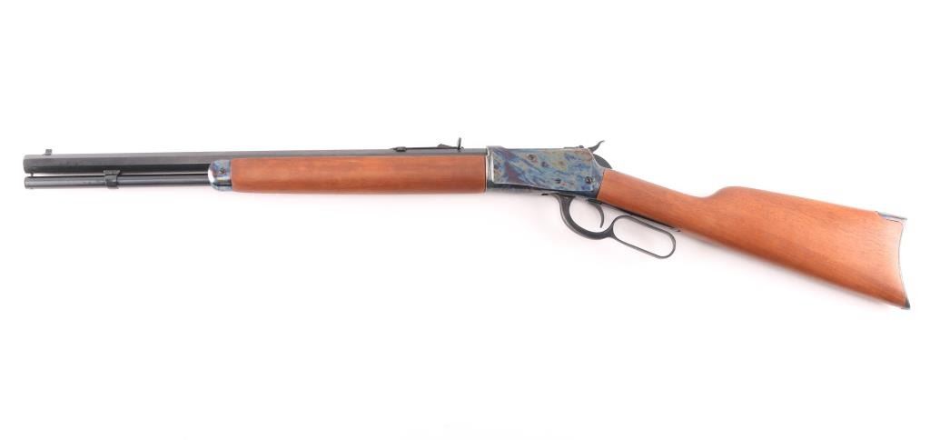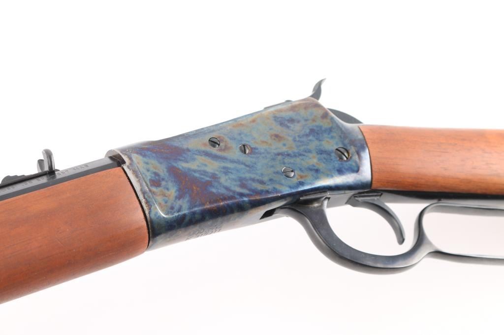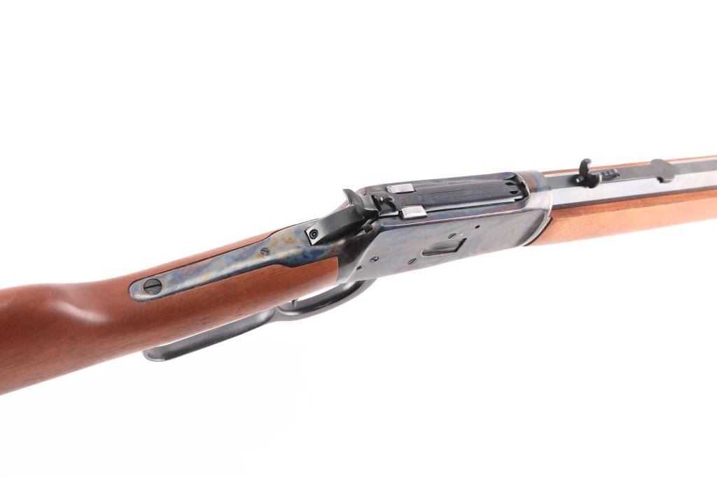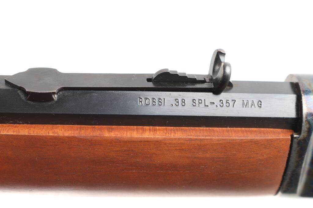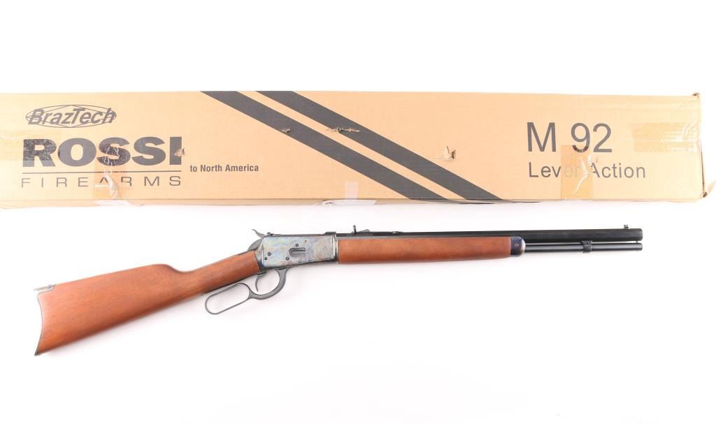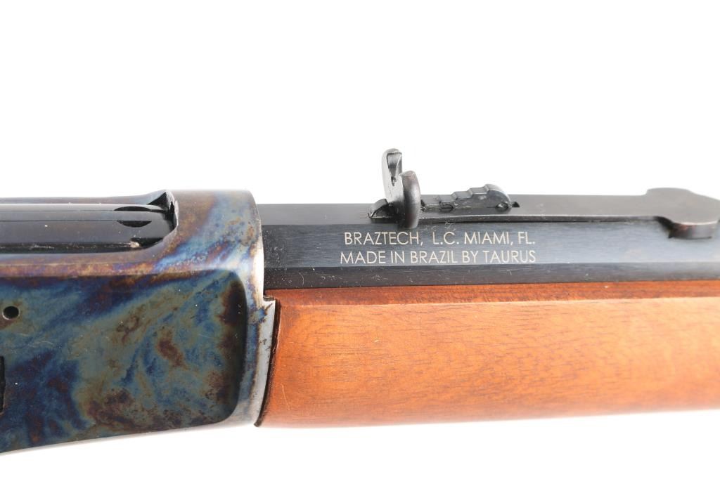 Sn: K315011. Lever action repeating rifle modeled after the Winchester 1892, chambered in .38 Spl/.357 Magnum, manufactured in Brazil. Imported by Braztech of Miami, F.L. with import marks on the left side of the barrel. Features a blued finish with case colored receiver, fore cap and buttplate, 20" octagonal barrel, full-length tube magazine, dovetailed blade front sight with brass bead, adjustable semi-buckhorn rear sight, smooth trigger, serrated hammer spur, rotating safety on the top of the bolt, smooth hardwood forend with barrel band, straight grip shoulder stock with curved metal buttplate. Bore is pristine. Retains 98% original finish. Wood is excellent, action is smooth. Like new. comes in factory box with matching label, manual and 2 keys for internal locking system, (Hammer)NRA Condition-Excellent. Modern Firearm.