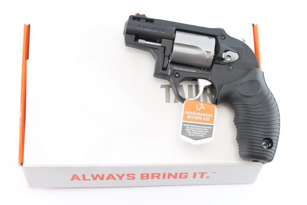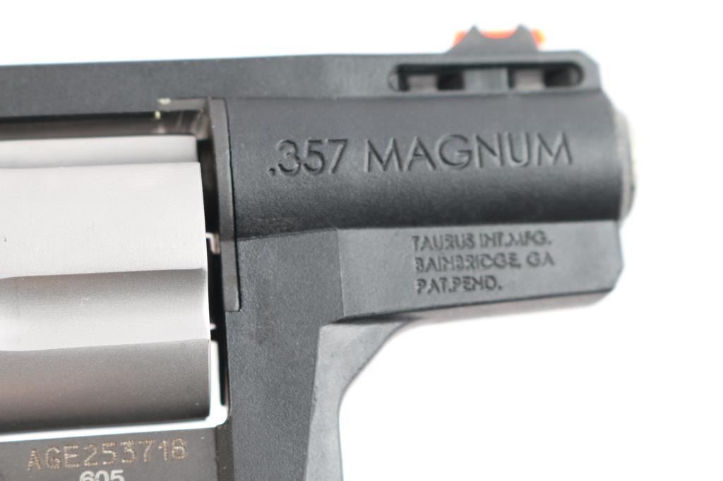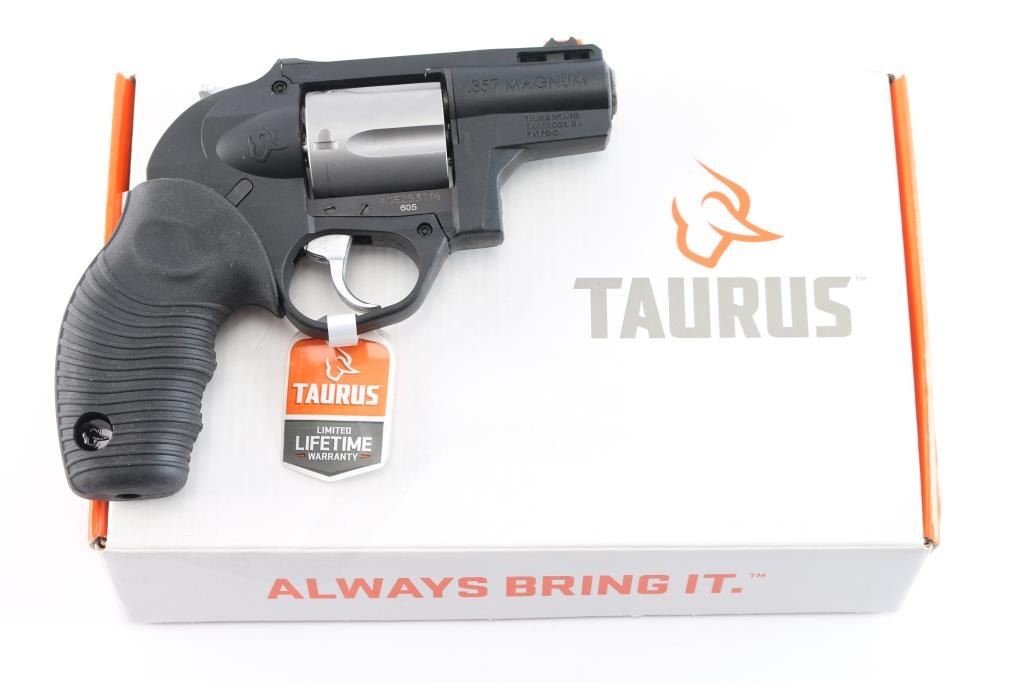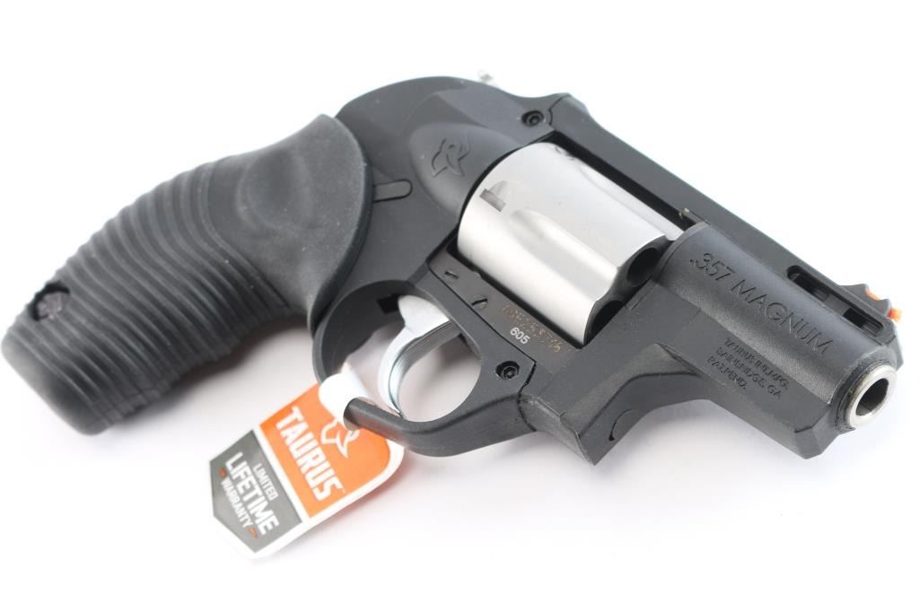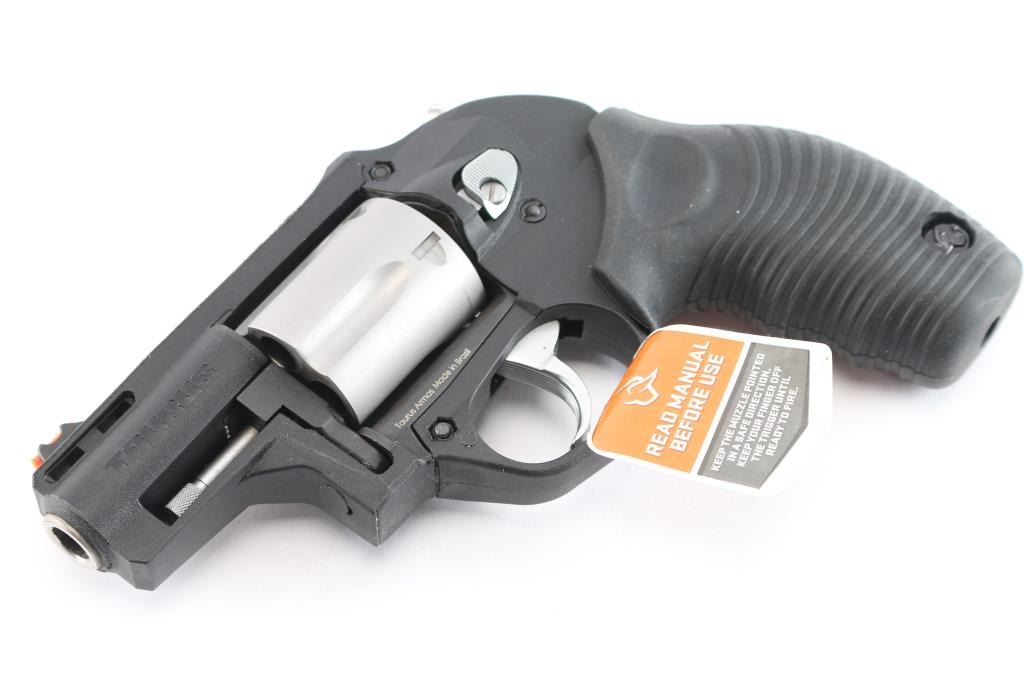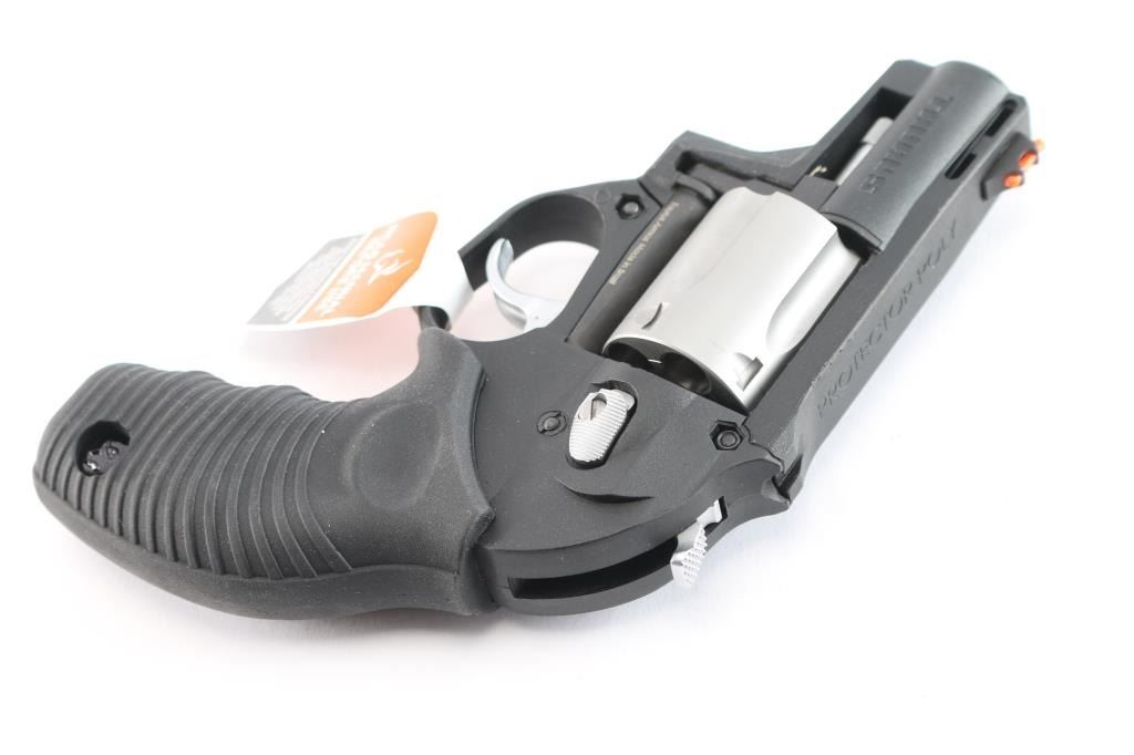 Brazilian made 'Protector Poly,' a double action and single sction revolver chambered for .357 Magnum. Imported by Taurus Int. Mfg. out of Bainbridge, GA. This is a steel frame revolver overmolded with Durethan (a fiberglass-reinforced nylon). Pistol features a 2" stainless vent ribbed barrel, stainless fluted five-round cylinder, serrated cylinder release, shrouded ejector rod with a knurled head, fixed red fiber optic front sight, notched frame rear sight, wide serrated curved trigger, external hammer, checkered hammer spur, transfer bar safety, and black finger groove ribbed rubber grips with Taurus medallions. Trigger, cylinder, and hammer have a satin stainless finish. The satin stainless finish retained is approximately 99% with nothing remarkable. Metal displays no rust or deformation. Grips are excellent. The bore looks bright with strong rifling, and the cylinder chambers are also excellent. The action is smooth and crisp, with a tight lock-up. Revolver includes original factory cardboard box, manual, extra set of grips, and tools.