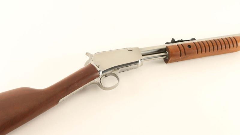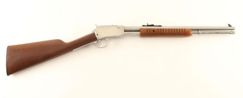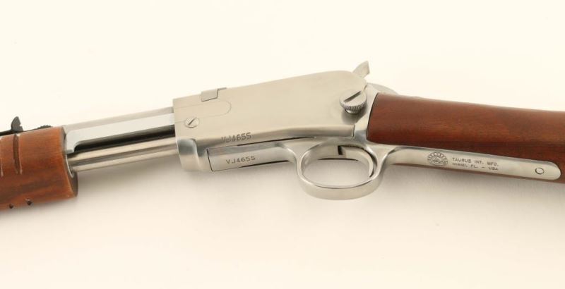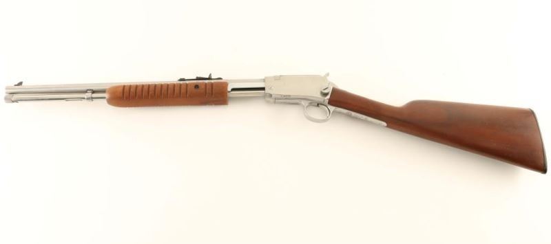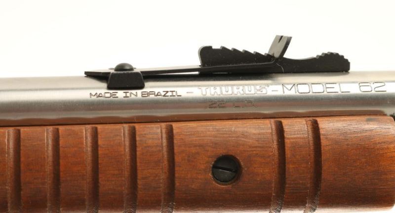 Brazilian made slide action repeating rifle modeled after the Winchester 62. Stainless steel construction, brushed finish, 16.5" barrel, full length tube magazine, dovetailed blade front sight, adjustable rear sporting sight, take down receiver, rotating safety on top of the bolt, smooth trigger, grooved hardwood slide handle and smooth straight grip shoulder stock with factory buttplate. Rifle shows only minimal handling marks with no major wear observed. Action is strong, bore is excellent and wood stocks are fine. Condition is near new. ***Modern Firearm***