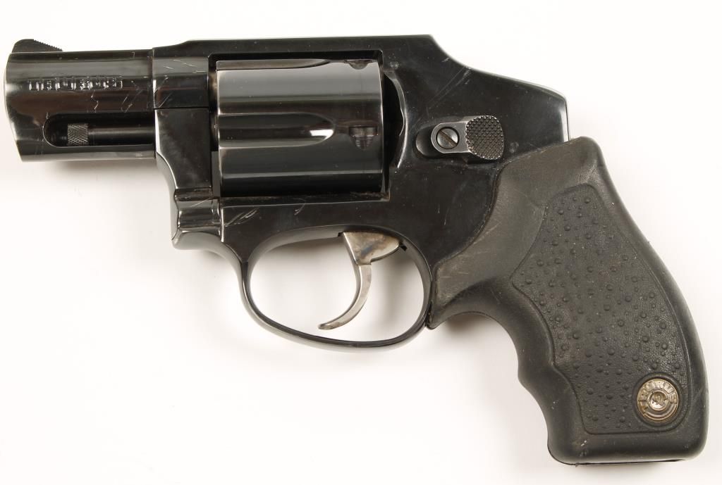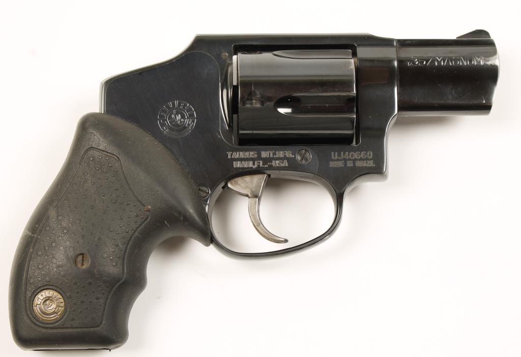 Brazilian made double action only hammerless 5 shot revolver with 2" barrel. Blued finish, pebbled black rubber grips, case colored trigger, shrouded ejector rod and fixed sights. Good bore and action. Condition: Good showing scratches in finish and high point wear. *Modern Firearm*