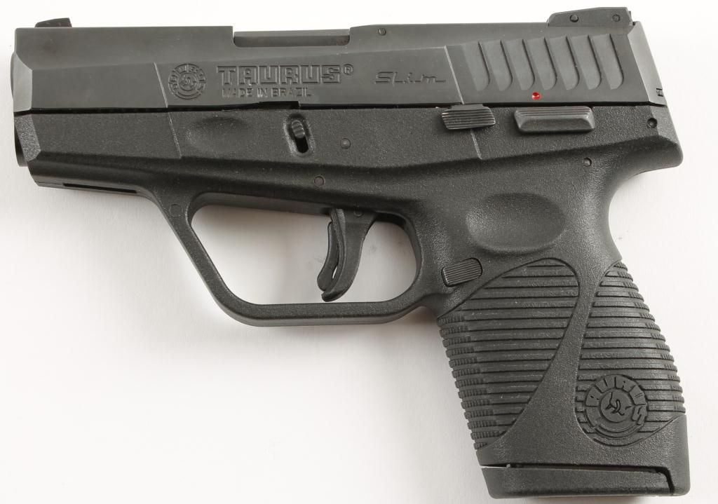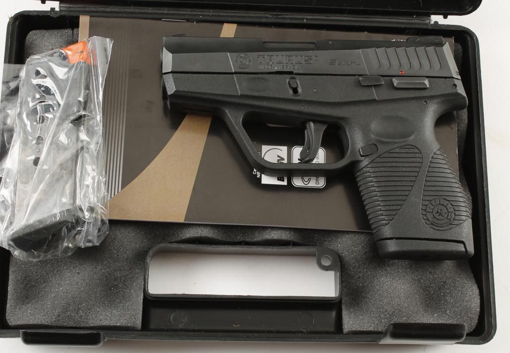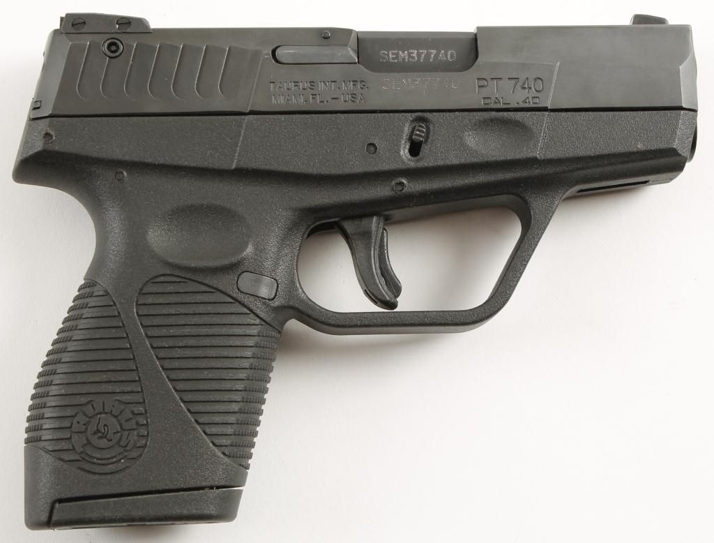 Taurus Mdl PT740 Slim Cal .40S&W SN:SEM37740Double action semi automatic pistol, blued steel slide, steel barrel, polymer frame, trigger shoe safety, manual safety, 3" barrel, integral striker lock with 2 keys, 3-dot fixed sights, 8-shot single stackmagazine, good bore, very good action. Includes original plastic box and papers. 2 magazines. Condition: Excellent.
