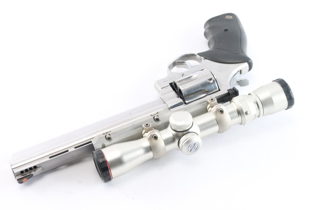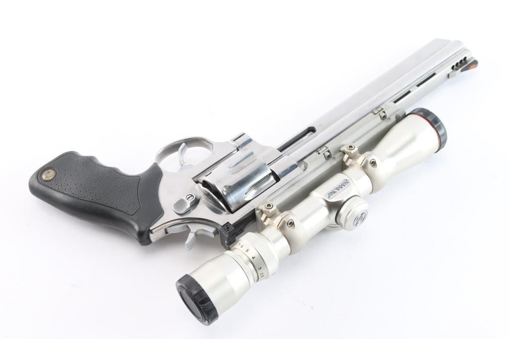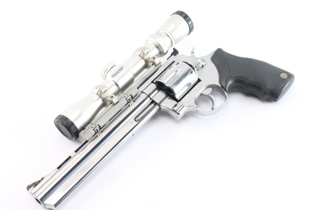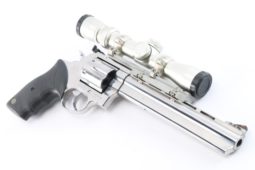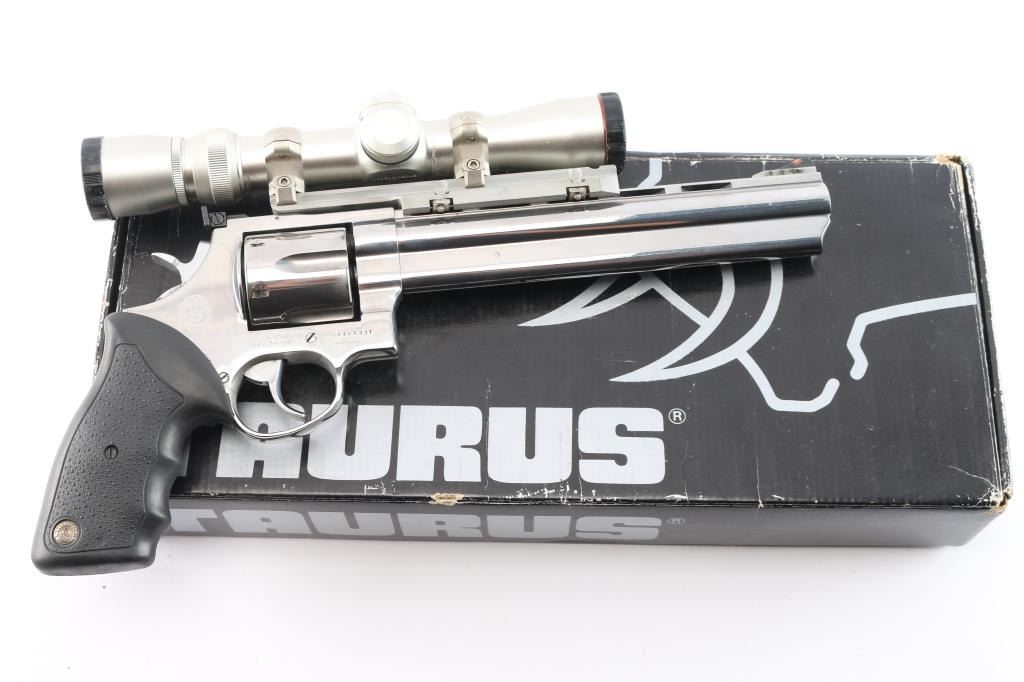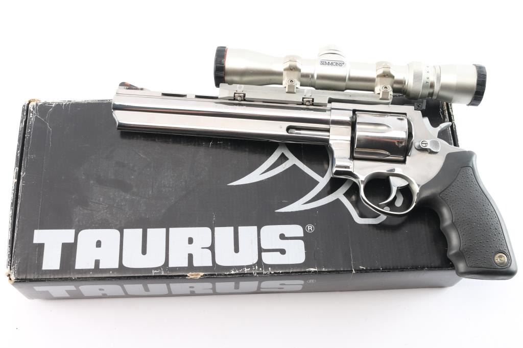 Brazilian made stainless steel large frame double action revolver chambered in .44 Magnum. Features a matte finish, ported 8 3/8" barrel with ventilated sighting rib & full underlug, raised ramp front sight with orange bar accent, adjustable rear sight, fluted six-shot cylinder, smooth wide semi-target trigger, semi-target hammer, transfer bar safety and two-piece pebbled black rubber grips with brass Taurus medallions. Mounted with a Simmons 2.5X-7X28 scope with duplex erticle, clear optics. Includes the original factory cardboard box with matching label. Revolver exhibits a slight drag line on the cylinder with some minor scratches Action is smooth with good lock-up, bore is excellent/bright and rubber grips are fine.