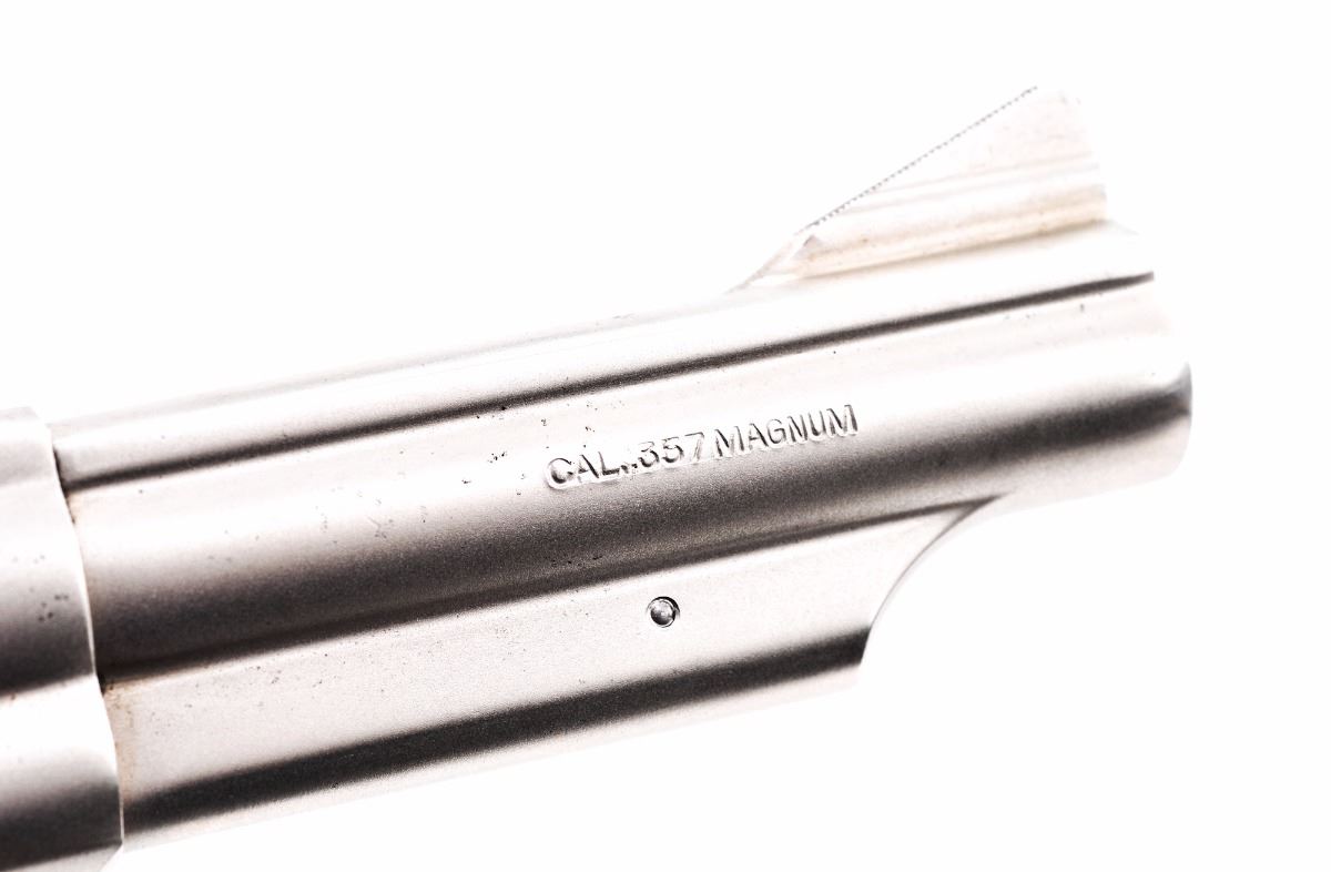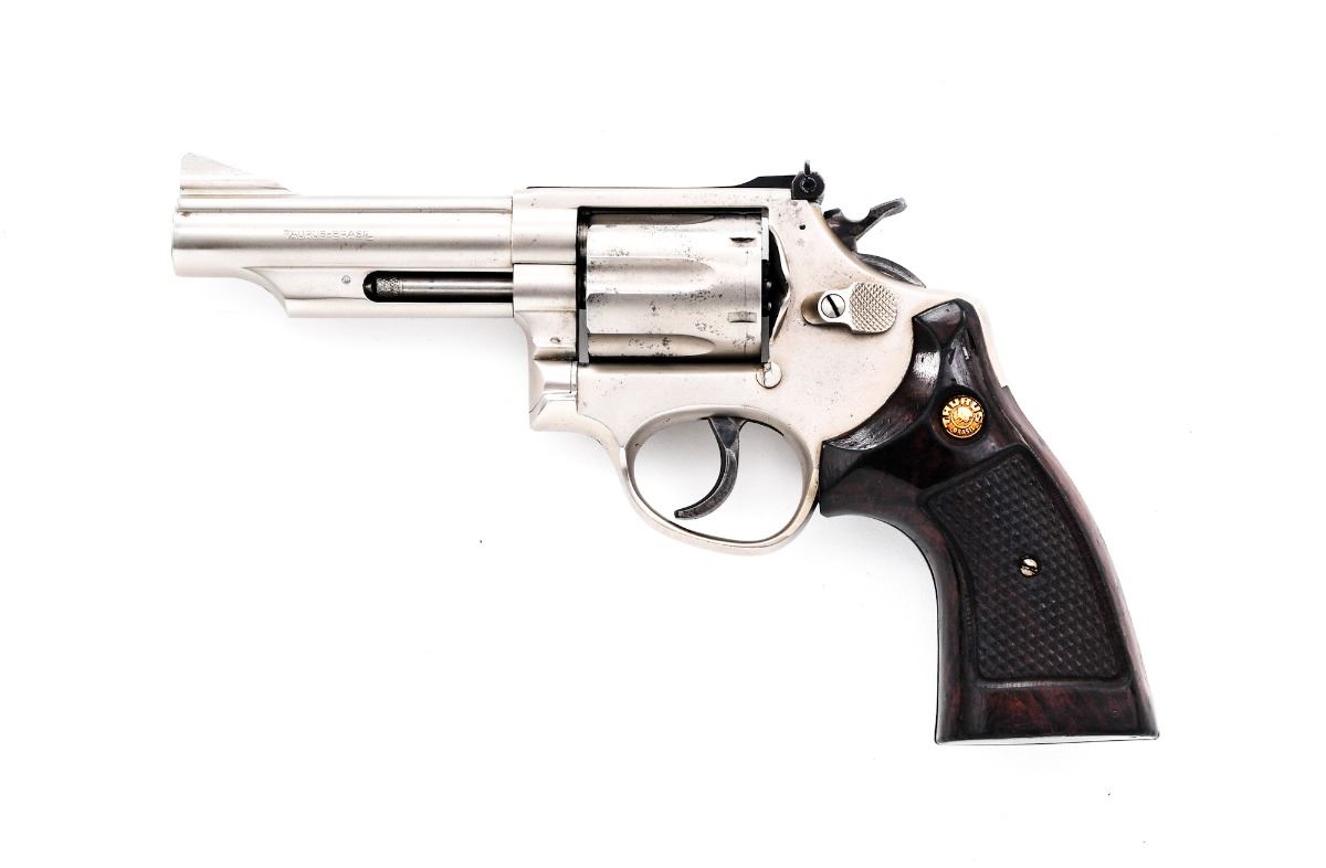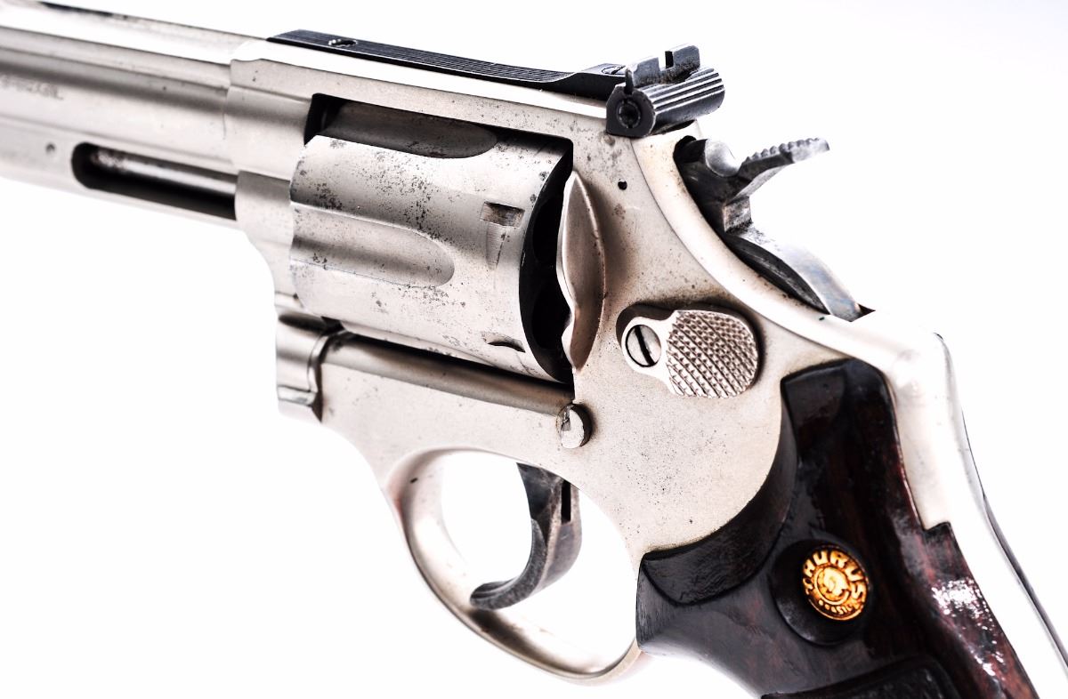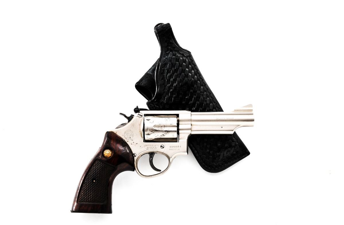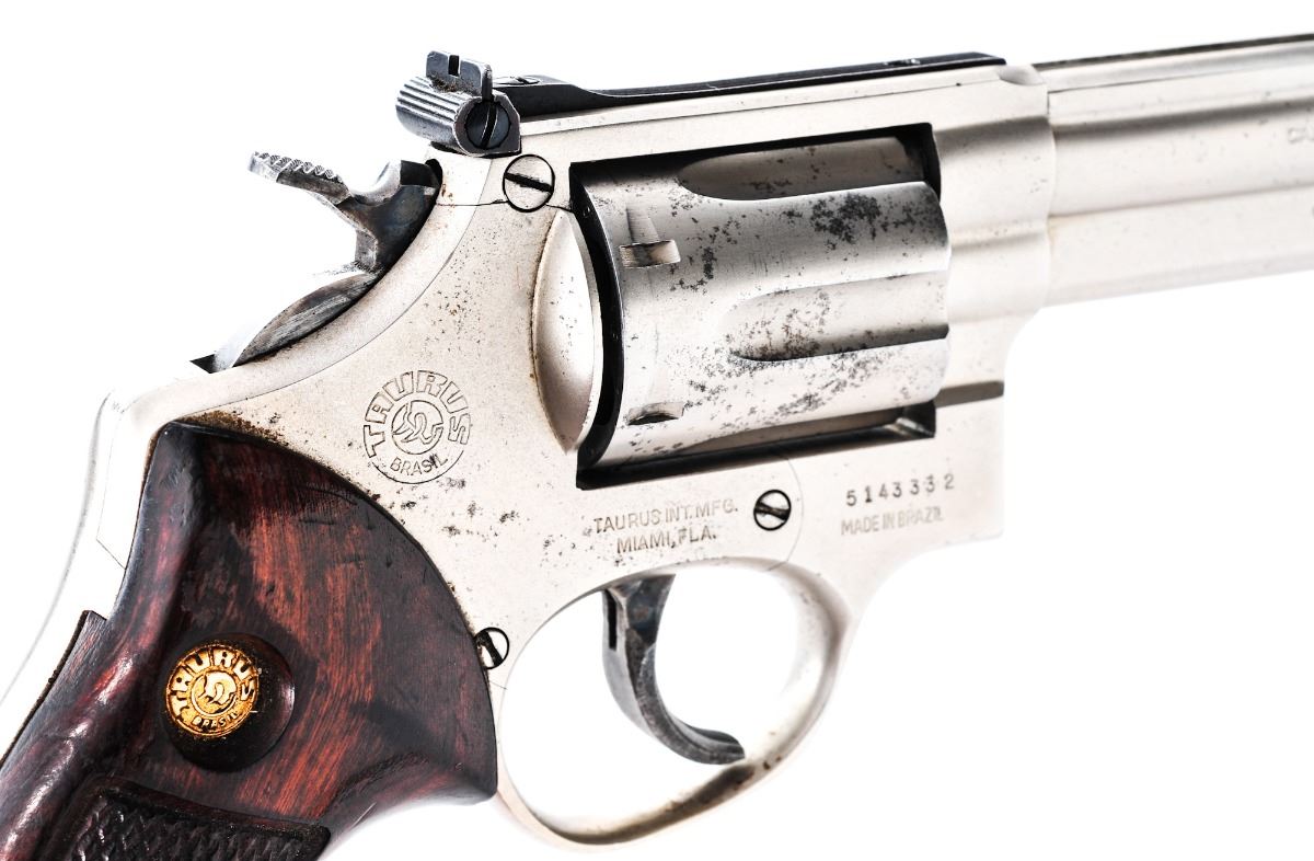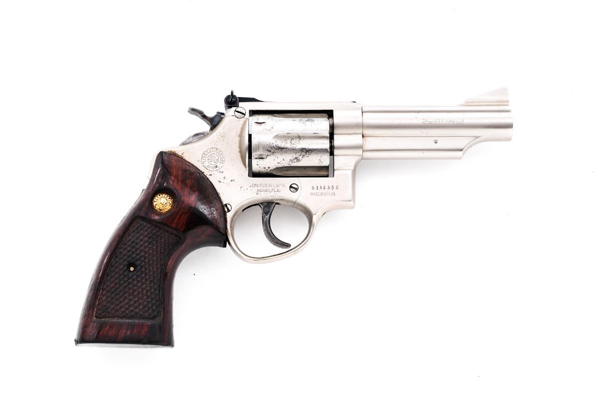 Taurus Model 66 Double Action Revolver, #5143332, .357 mag. cal., 4'' barrel, nickel finish, checkered hardwood grips with Taurus medallions, in Triple K black basketweave-type holster. Condition is very good retaining approx. 85% of its finish, with thinning at cylinder and light general spotting. Grips show light to moderate use. Action is good, bore is good. Est.: $200-$400. (Modern)