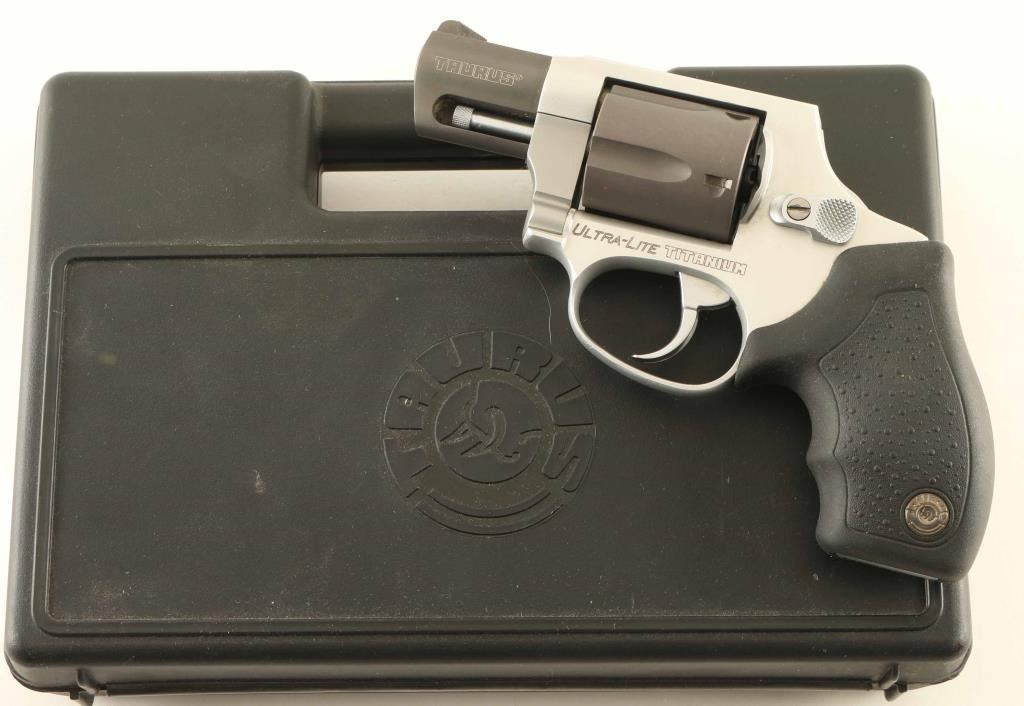 Revolver, double-action. 5-rd capacity. Brazilian made, ultra-lite revolver. 2" ventilated barrel. Iron fixed sights. Gray anodized titanium frame, with dark gray barrel, and cylinder. Black rubber grips with Taurus medallions. bore, and cylinder chambers are bright/excellent. Action is crisp/tight. No hammer spur. Comes in the original Taurus black plastic box, with manual, and security system keys. revolver is in almost new condition. NRA Condition-Excellent. Modern Firearm.