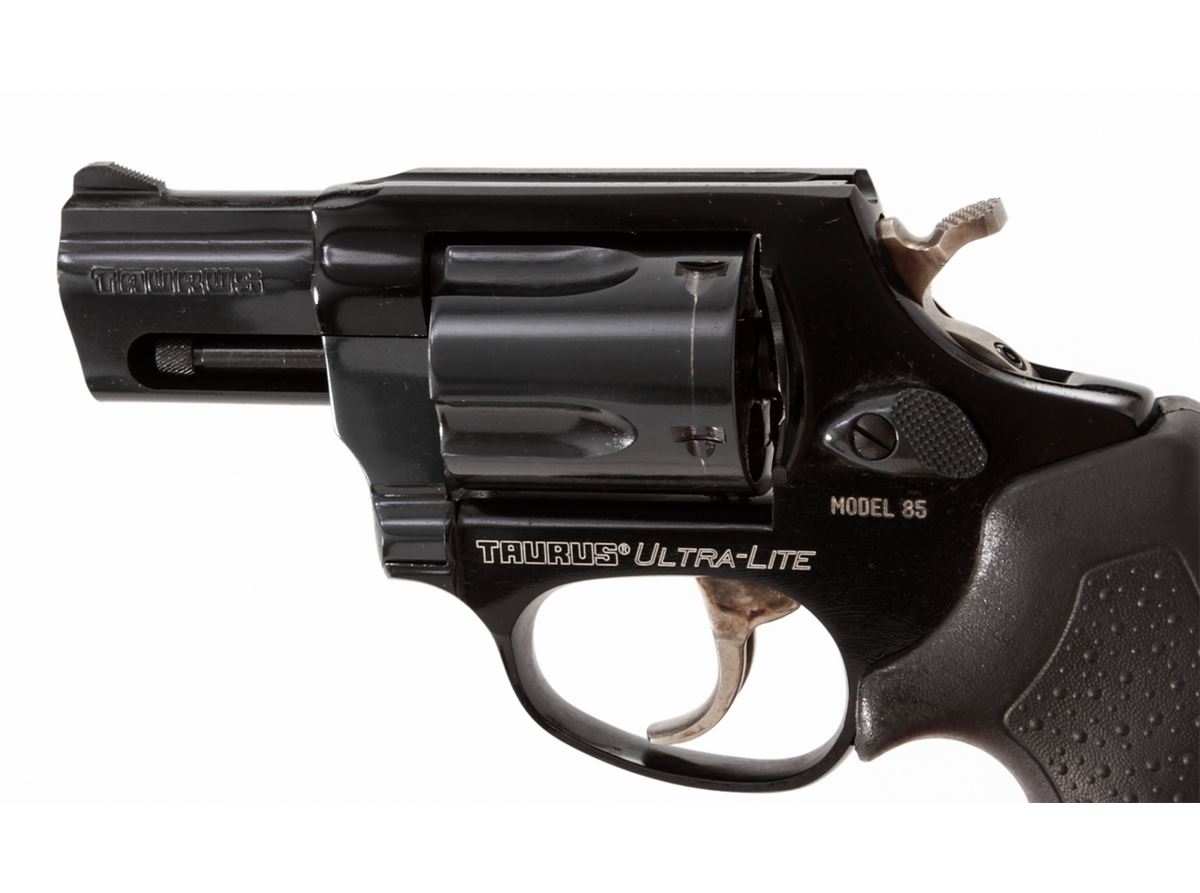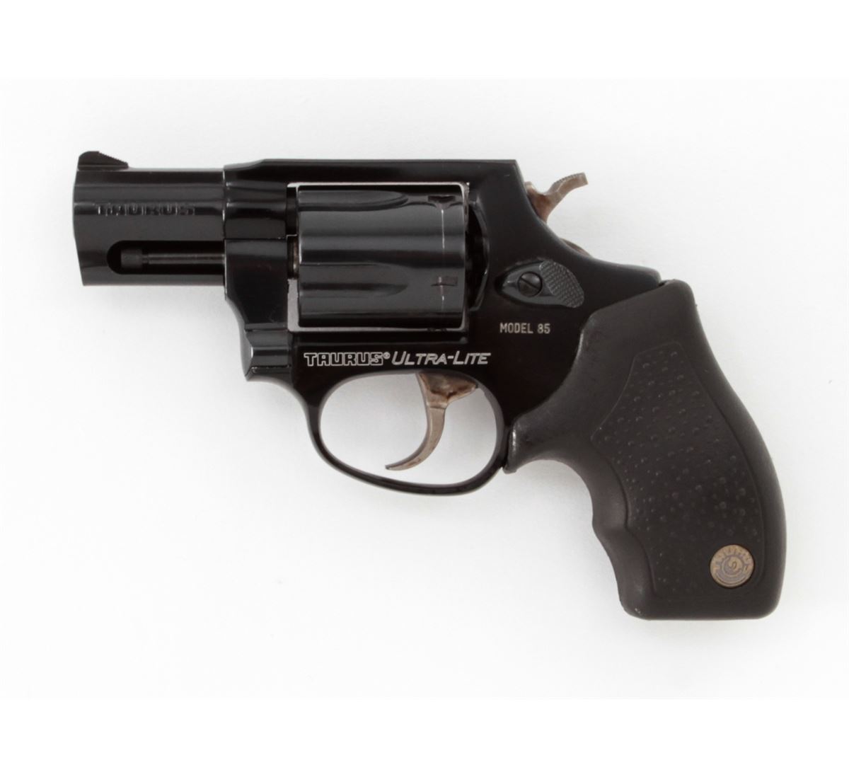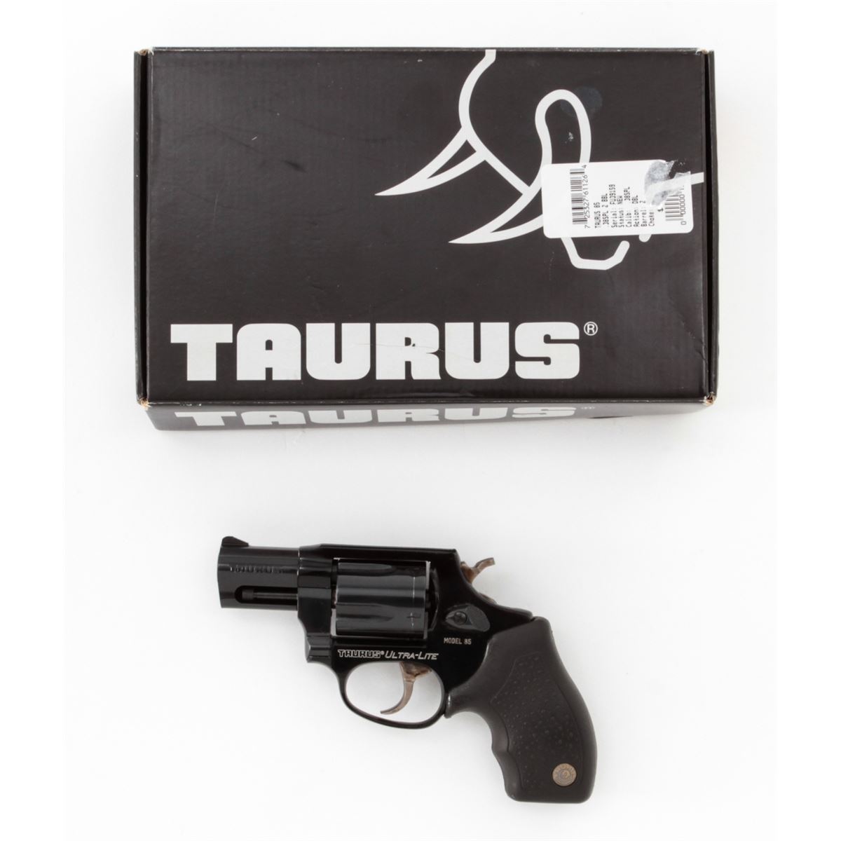 Taurus Model 85 Ultra-Lite Double Action Revolver, #FU39159, .38 Spl. cal., 2'' barrel, dark blue/black finish, textured hard rubber Taurus grips, fixed sights, extra pair of grips, Taurus security system with two (2) keys, in original box with matching end label and the owner's manual. Condition is excellent, remaining near new and unfired, with light index line to cylinder. Retails @ $399.95. Est.: $200-$350. (Modern) (Field Time)(Not available to Calif. residents.)
