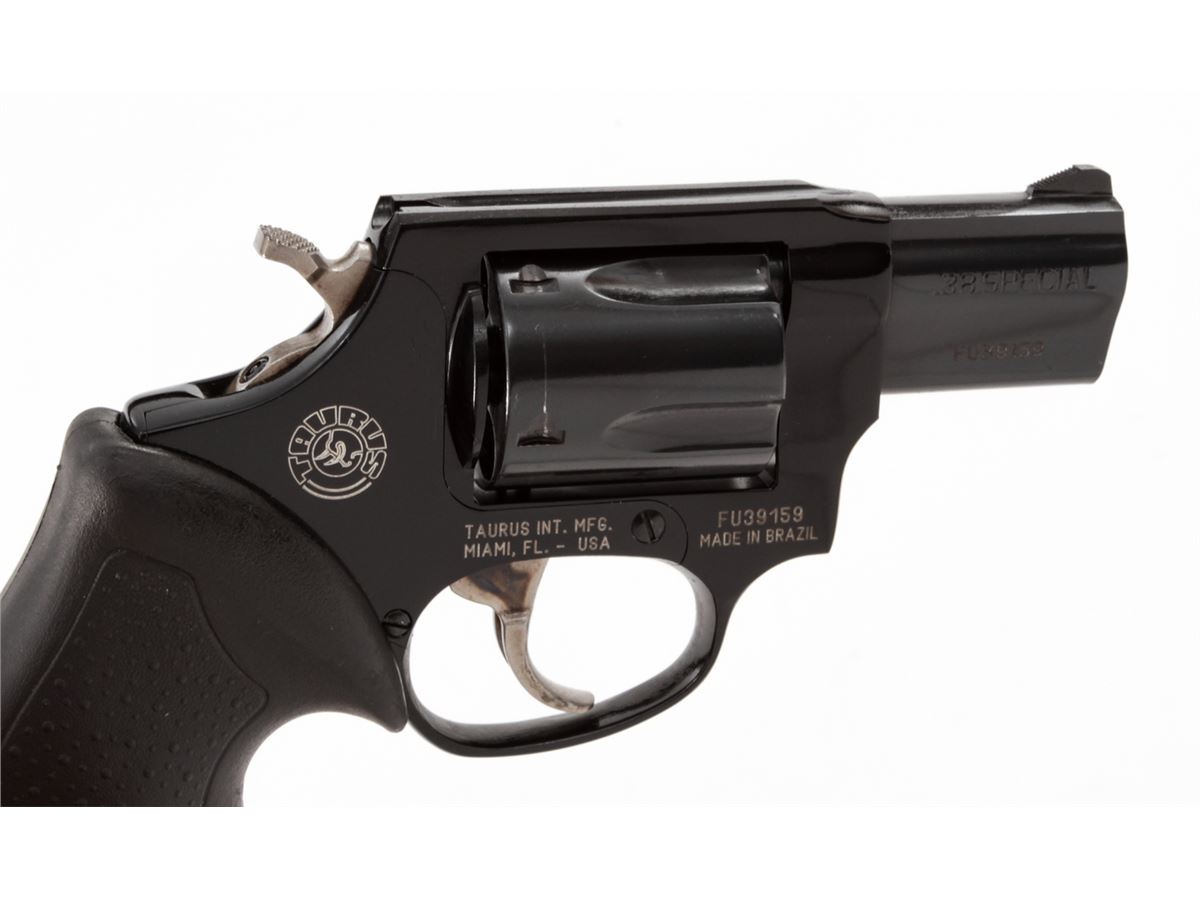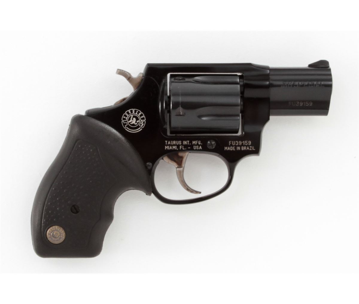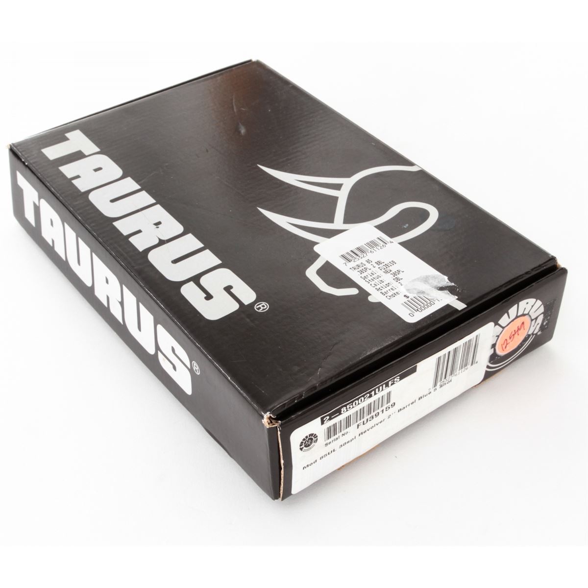 Taurus Model 85 Ultra-Lite Double Action Revolver, #FU39159, .38 Spl. cal., 2'' barrel, dark blue/black finish, textured hard rubber Taurus grips, fixed sights, extra pair of grips, Taurus security system with two (2) keys, in original box with matching end label and the owner's manual. Condition is excellent, remaining near new and unfired, with light index line to cylinder. Retails @ $399.95. Est.: $200-$350. (Modern) (Field Time)(Not available to Calif. residents.)