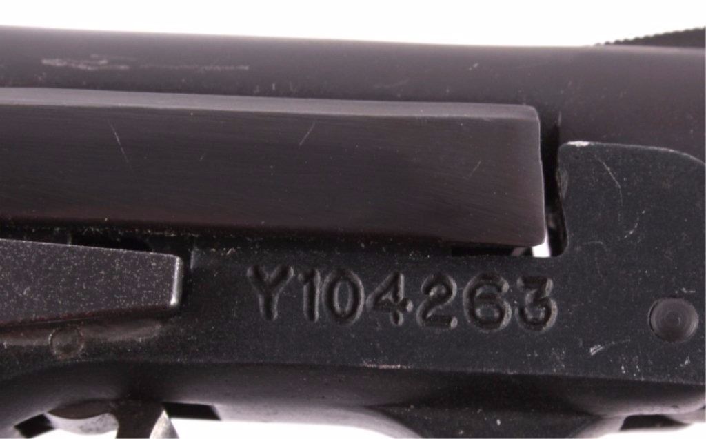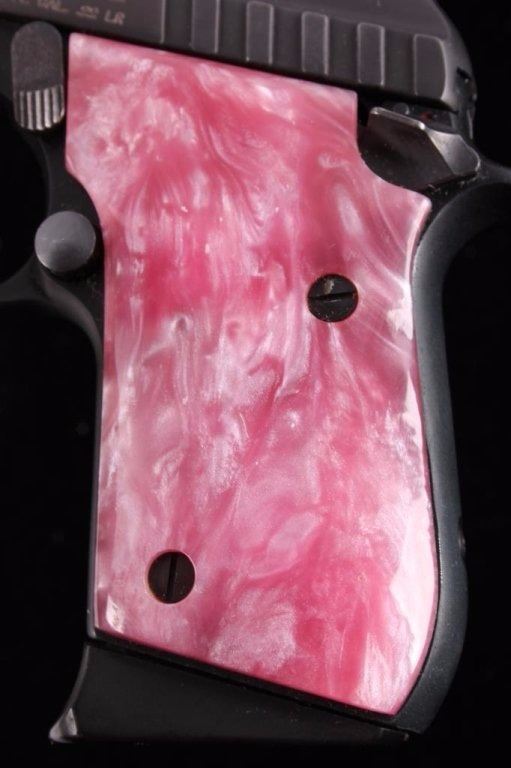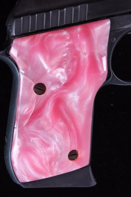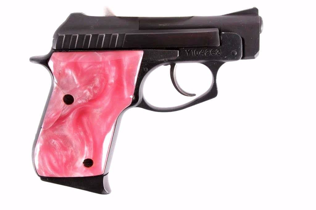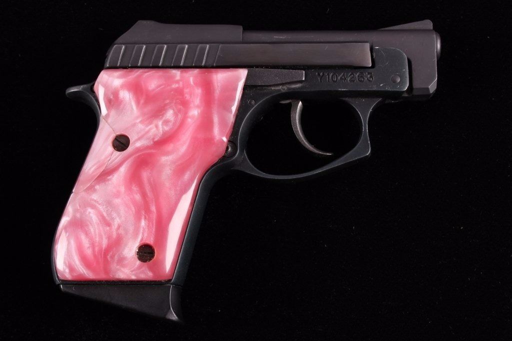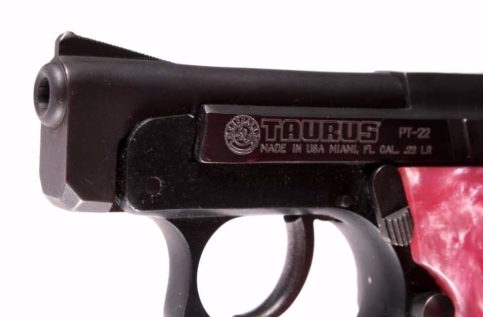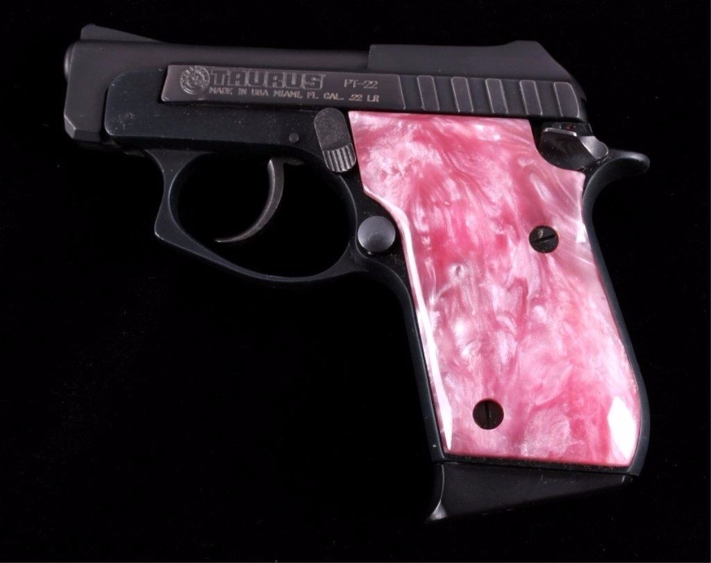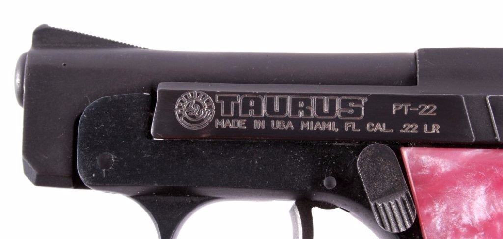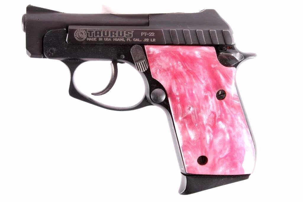This is a Made in the USA Taurus Model PT-22 .22 long rifle semi-automatic pistol. The pistol has a dark original finish condition with pink marble like plastic grips and the original magazine with a grip extension. The firearm is in good working condition. The handgun features a blow back action and is tip up barrel loading mechanism. The right grips shows a slight crack, but is not lose. Serial number Y104263.