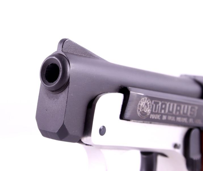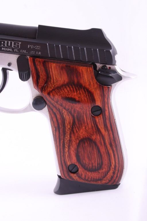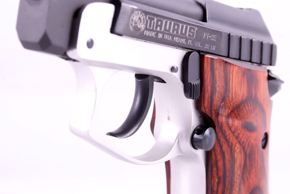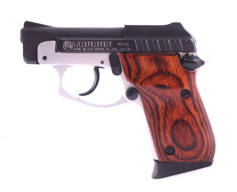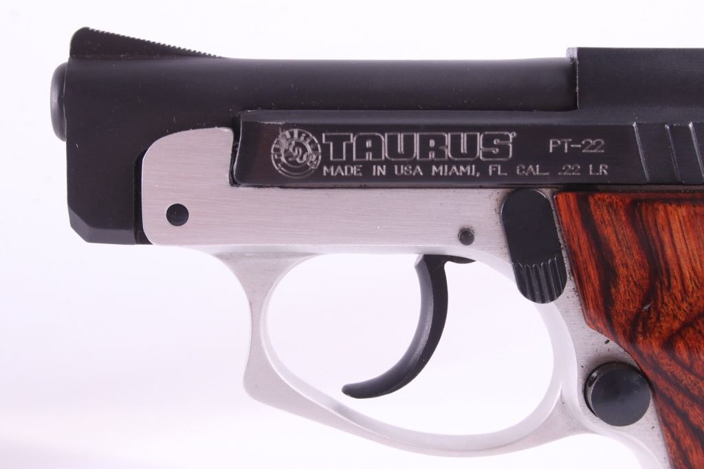 Included in this lot is a Taurus Model PT-22 semi-automatic pistol. This Taurus is chambered in .22 caliber and has a blue'd slide with a nickel frame. The blue'd barrel measures 2 3/4". This pistol utilizes hardwood grips and an eight shot magazine. This pistol has fixed front and rear sights. Serial Number: Y159945. The firearm is in good condition with no noticeable loss to the finish and operates as intended. This is a modern firearm and requires a FFL transfer or NICS background check.