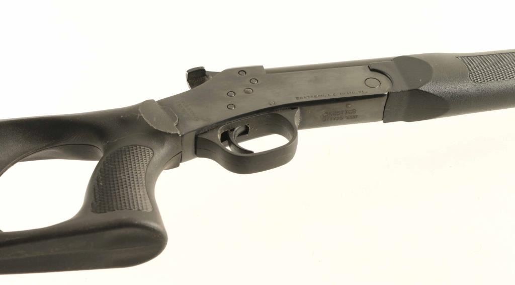"Snake Charmer" style single shot break open shotgun is made in Brazil, imported by Braztech, Miami FL. Accepts up to 3" shells. Features blued finish, black polymer forend with checkered panels & sling swivel, black polymer stock with checkered pistol grip and ammo storage in butt, 18" plain barrel with fixed Cylinder choke, brass front bead, exposed hammer, push button latch on receiver top, manual safety on receiver left side. Butt is short, approx 10" length of pull, does not have a sling swivel at rear. Bore is very good condition, needs cleaning. Retains 90% blue with scuffs and scratches. Stock and forend are very good condition with scrapes, some dirt, some thin rust on one buttstock screw. Condition is NRA Very Good *** Modern Firearm ***