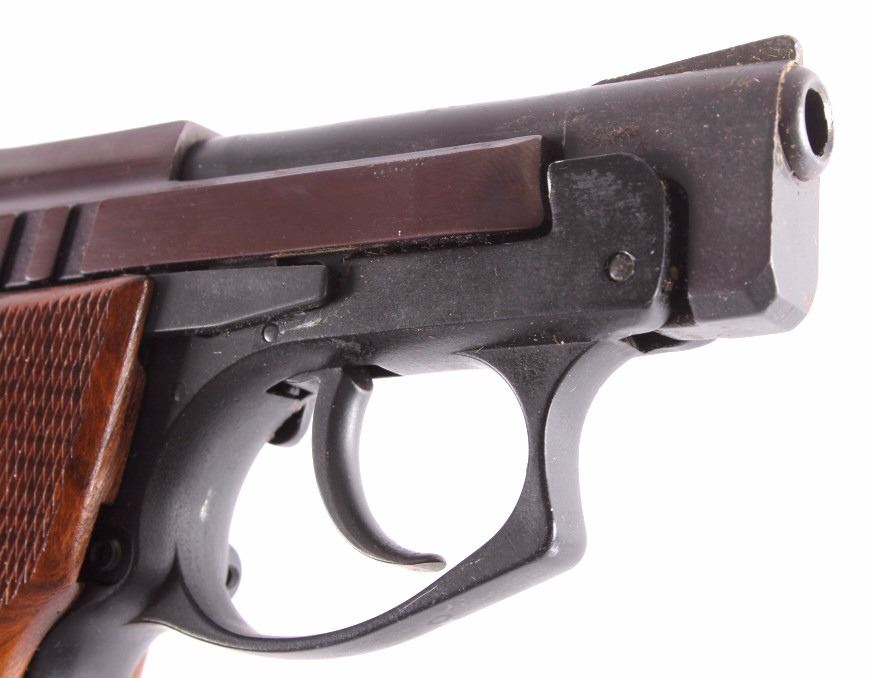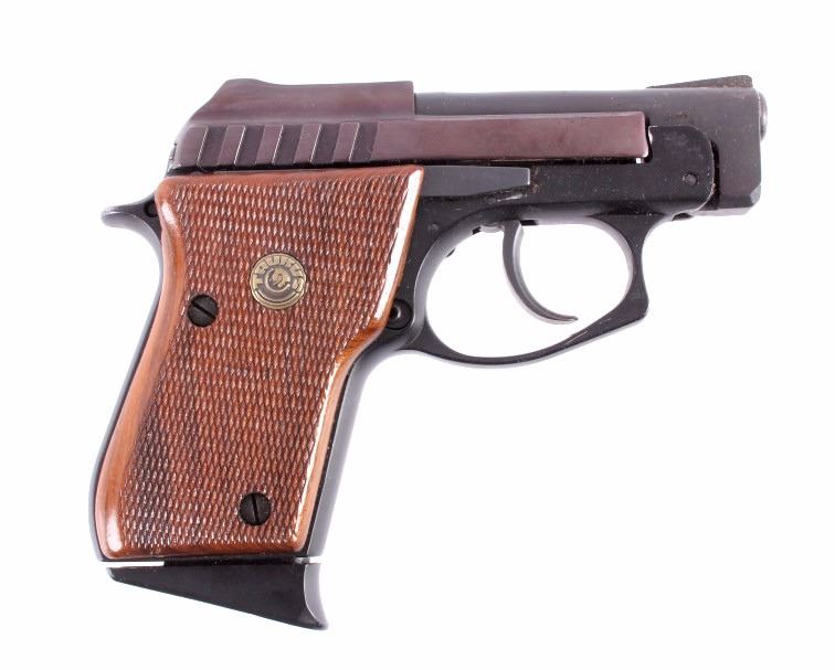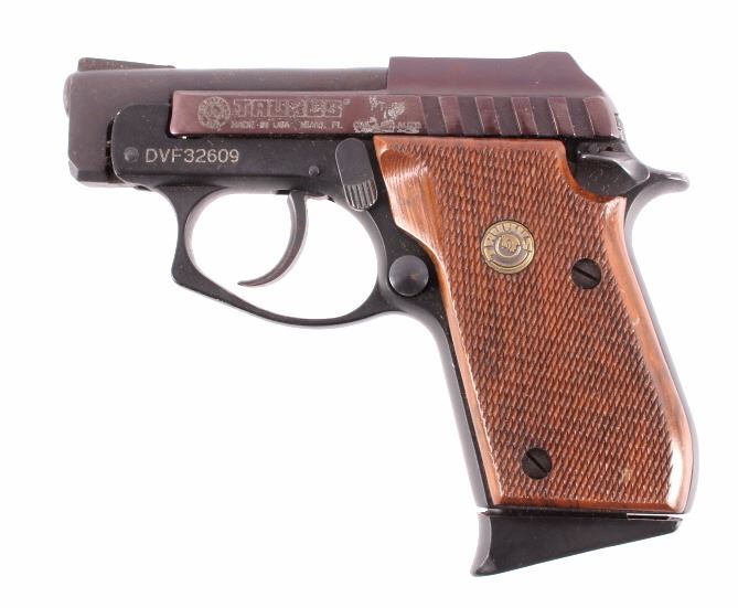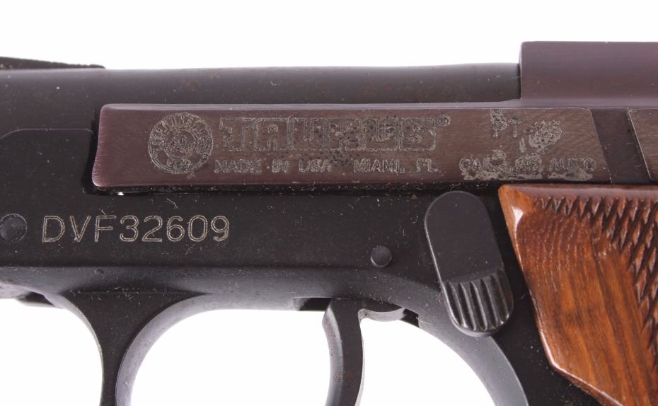 This is a Taurus PT-25 semi-automatic pistol chambered in the .25 auto caliber. The pistol has a blued steel frame and slide with checkered walnut grips and a tip-up barrel. The left side of the slide is marked "Taurus PT-25 / Made in U.S.A. Miami, FL / Cal. .25 Auto". Each grip has an inlaid brass medallion marked "Taurus". The pistol is in good condition. it measures 3.75" x 5.5". Serial number is DVF32609. This is a modern manufactured firearm and requires an FFL Transfer or NICS Background Check. NO MAGAZINE INCLUDED (PICTURES SHOWN FOR EXAMPLE).